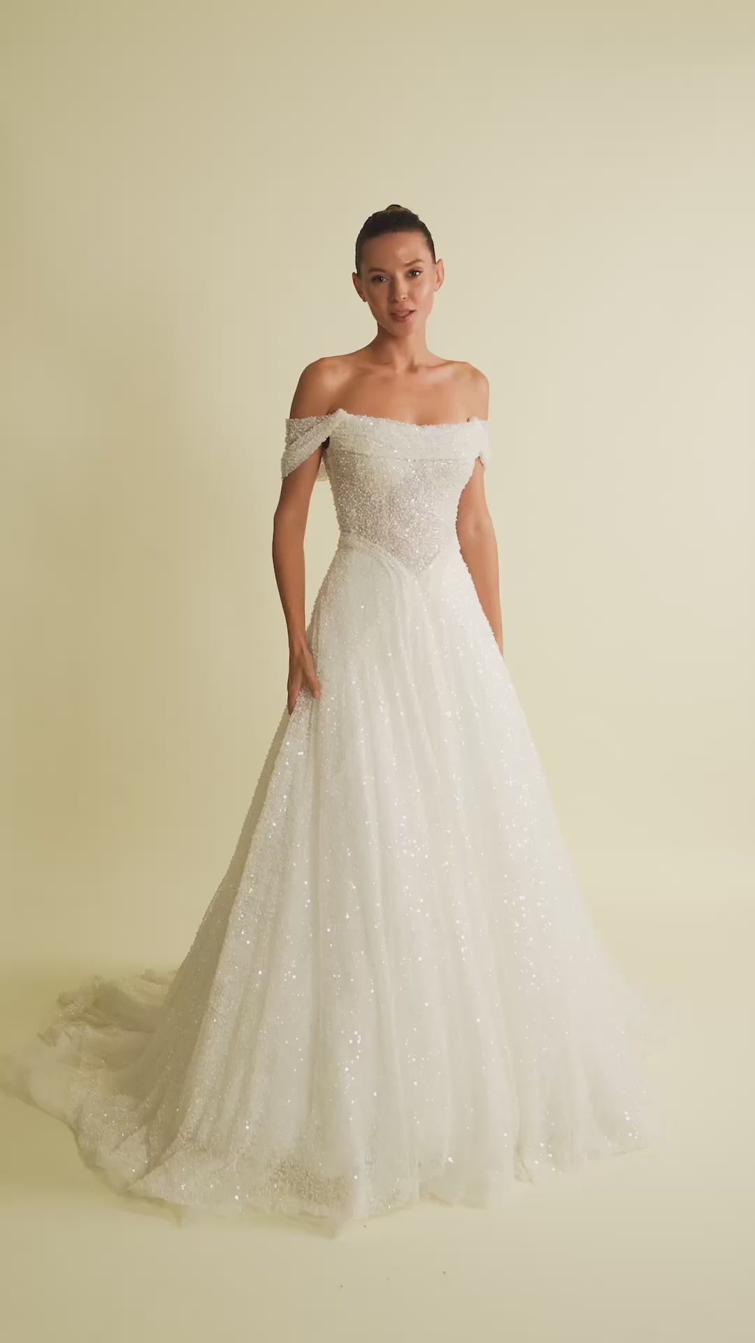 Masalsı bir siluete sahip bu prenses gelinlik model, dantel işlemeleriyle göz kamaştırır. Prenses yaka detayı ve zarif askılarıyla, her gelin adayına peri masallarını anımsatan bir zarafet sunar.