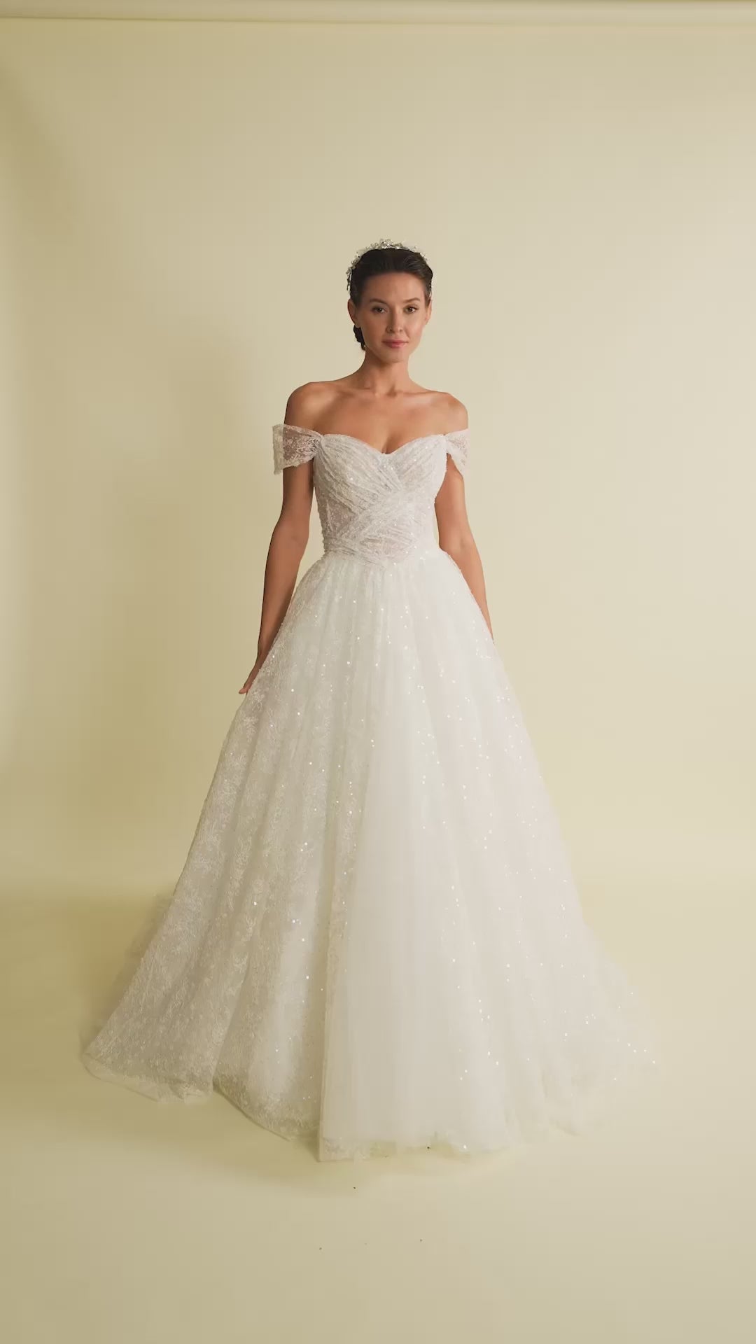 Romantizmin en zarif hâlini taşıyan bu prenses model, ince dantel işlemeleriyle göz kamaştırır. Askılı formu ve prenses yakasıyla sofistike bir masal görünümüne sahip tasarım gelinlik modeli.