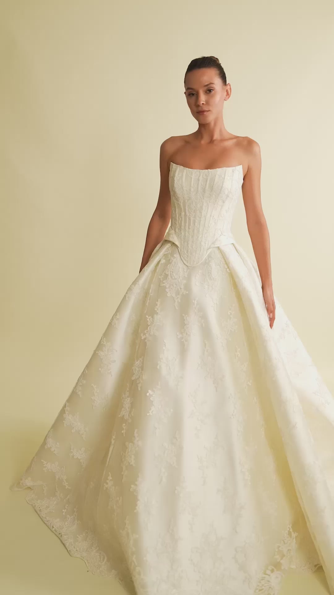 Korse formundaki straplez yapısı, vücuda zarif bir uyum kazandırır. Dantel işlemeleriyle süslenmiş bu gelinlik, klasik güzelliği yeniden tanımlar.