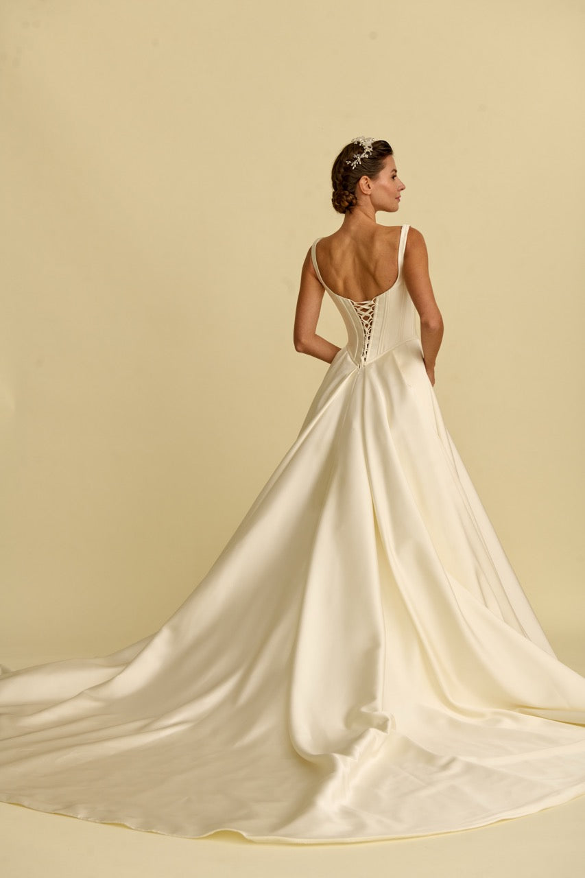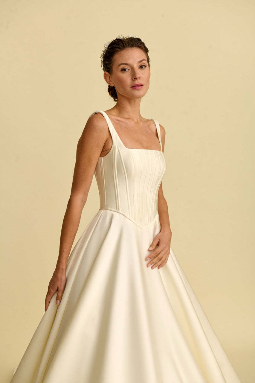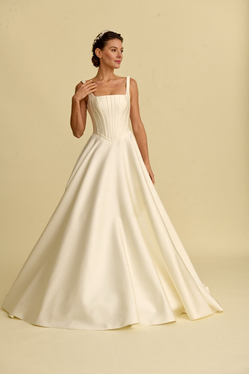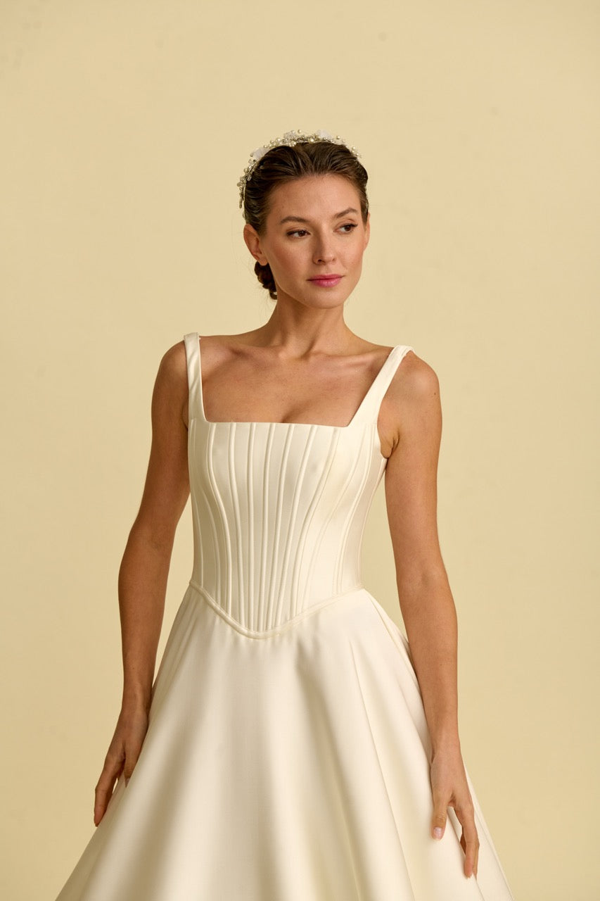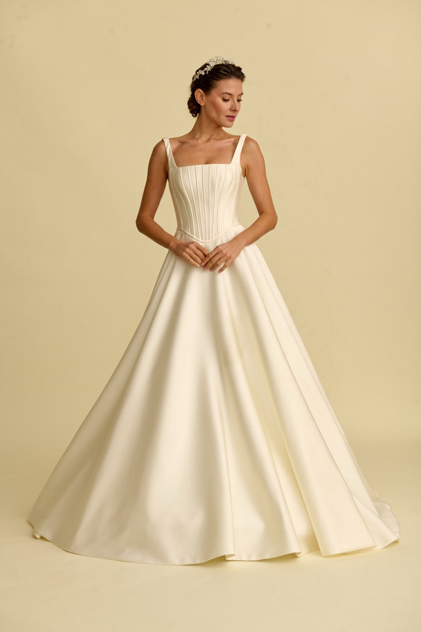 Modern kare yaka tasarımı, işlemeli korsesiyle zarafeti incelikle vurguluyor. Prenses kesimi ile zamansız bir güzelliği çağdaş bir dokunuşla ortaya çıkaran prenses gelinlik modeli.