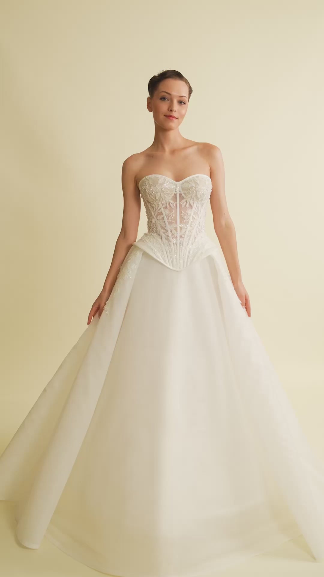 Beden tasarımıyla zarif omuz hattını öne çıkaran bu gelinlik, işli dantelleriyle saf bir zarafet taşır. Her detayı göz kamaştırıcı bir inceliğe sahiptir.