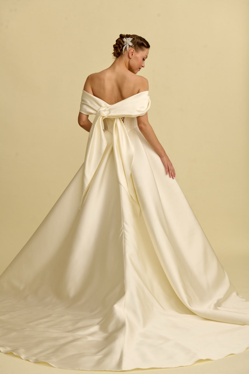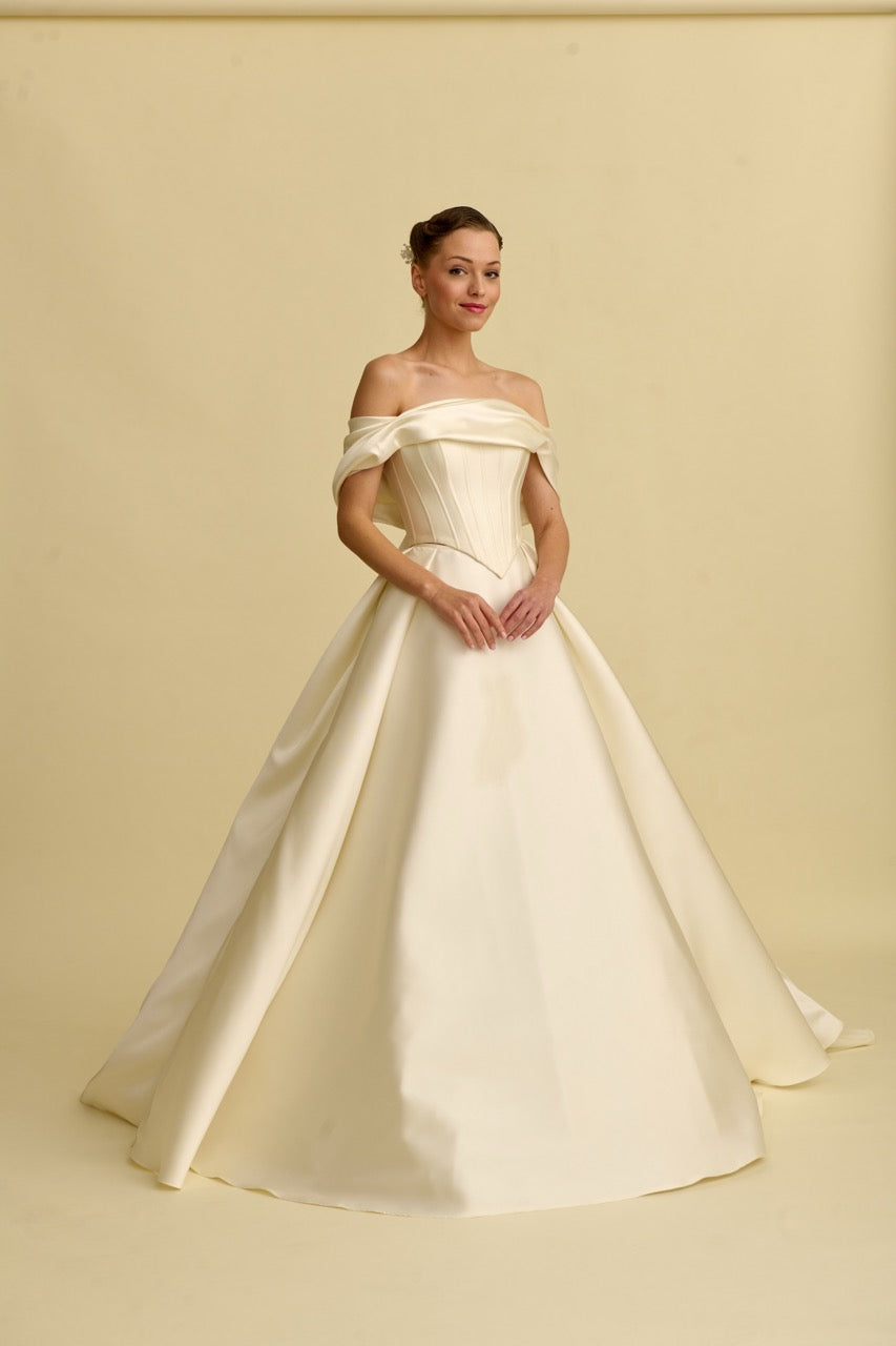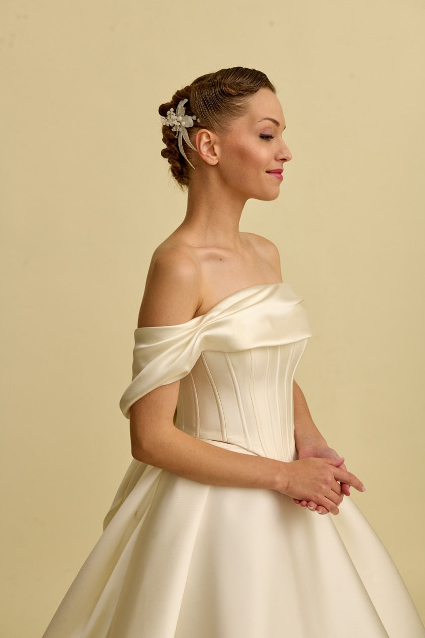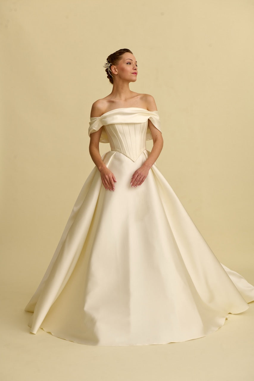 Satenin ışıltısı ve korsenin zarif formu, prenses yakayla kusursuz bir uyum içindedir. Klasik ama etkileyici bir güzelliğe sahip prenses gelinlik modeli.