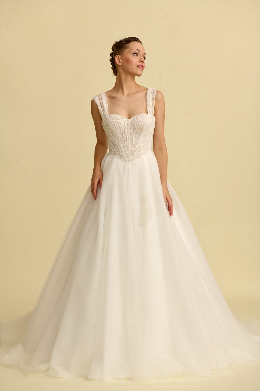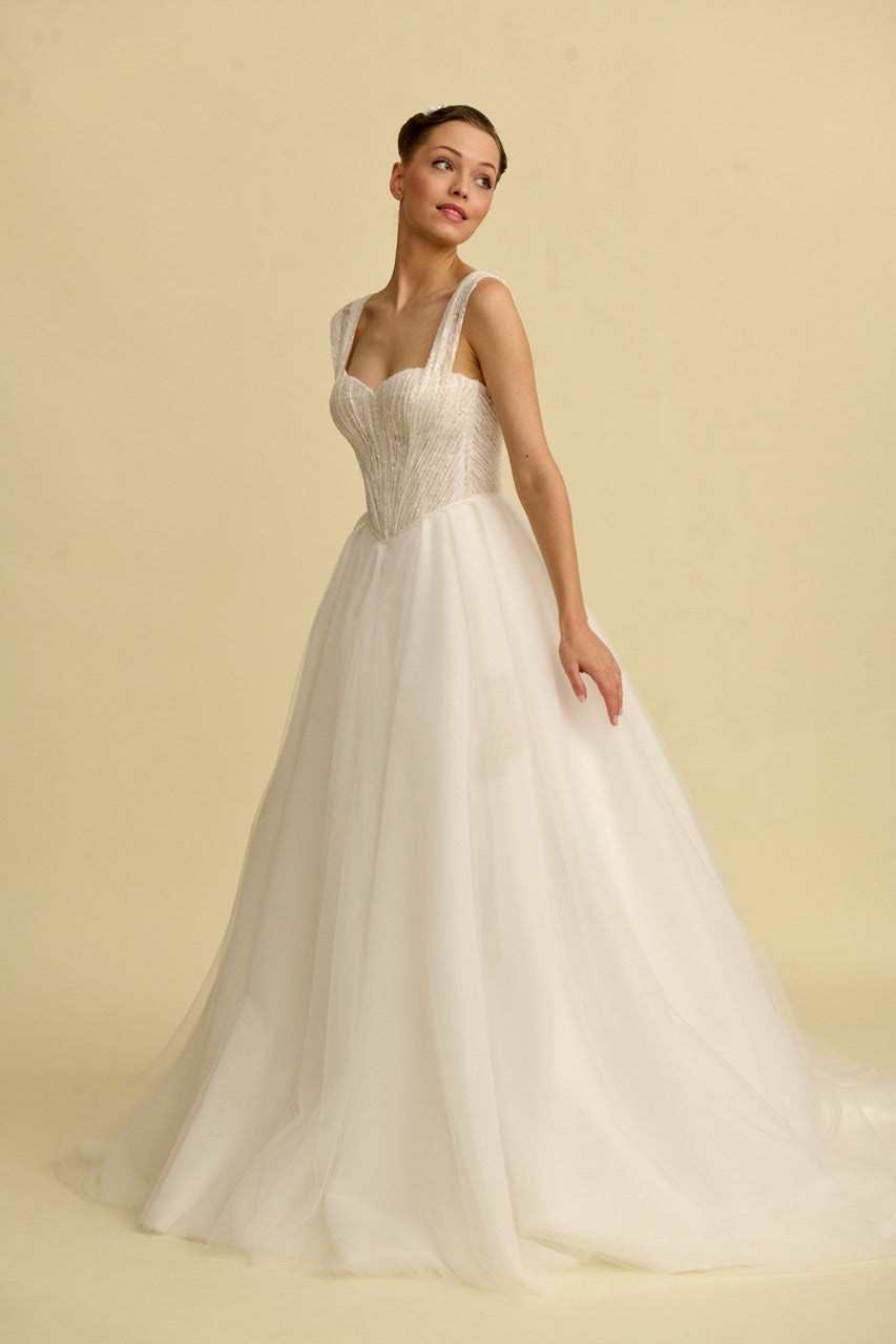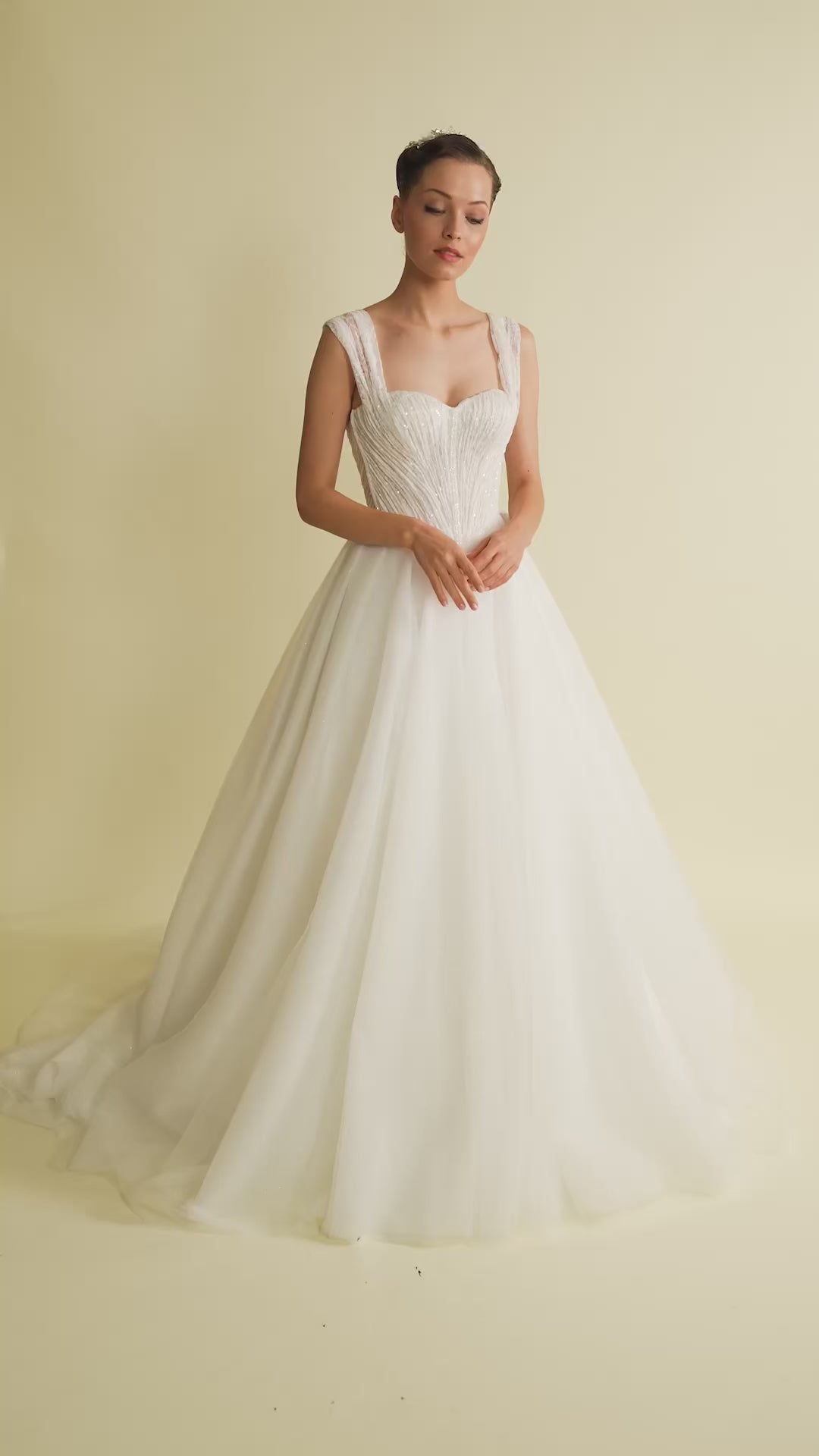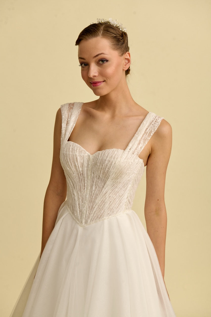 Dantel işlemeli bedeniyle göz kamaştıran bu model, zarif askılarıyla sade bir ihtişam yaratıyor. Klasik güzelliği yansıtan ışıltılı gelinlik modeli.