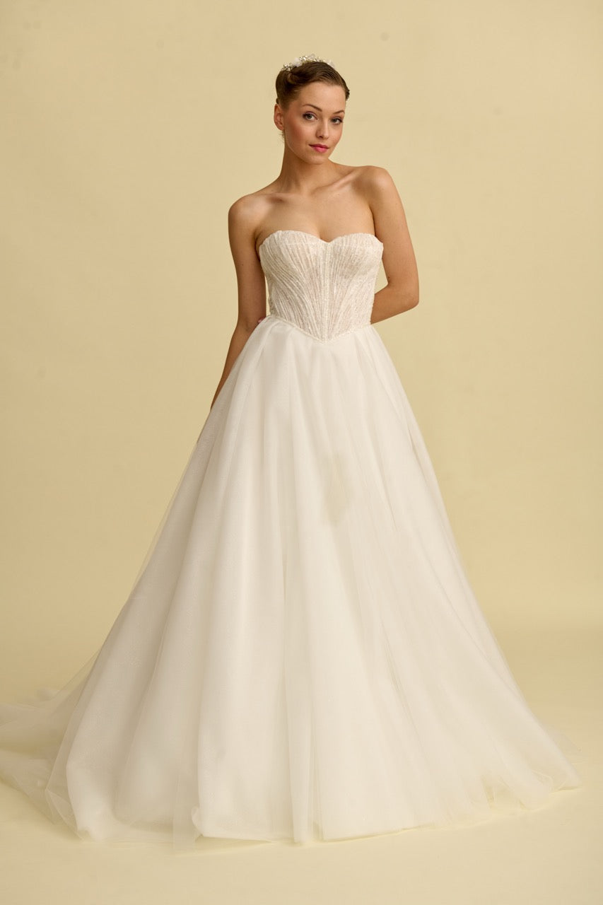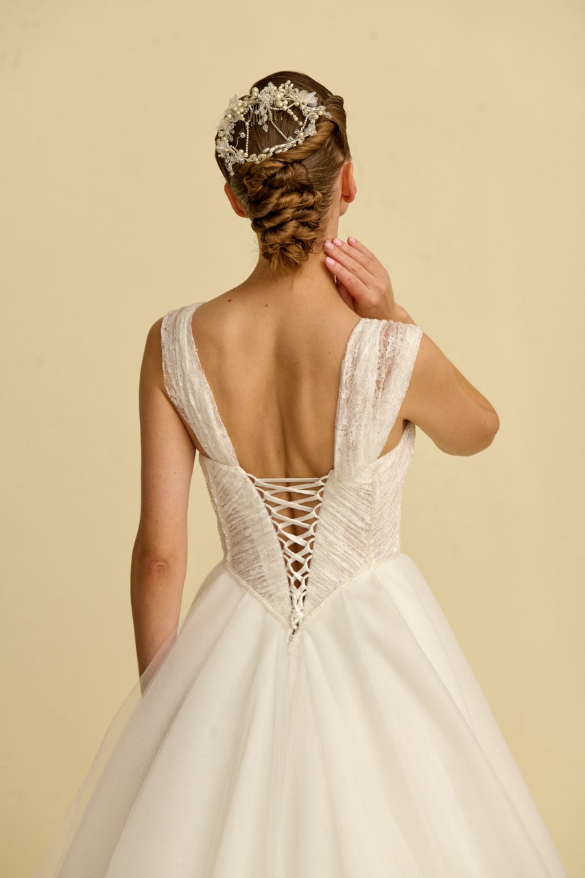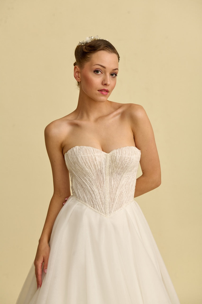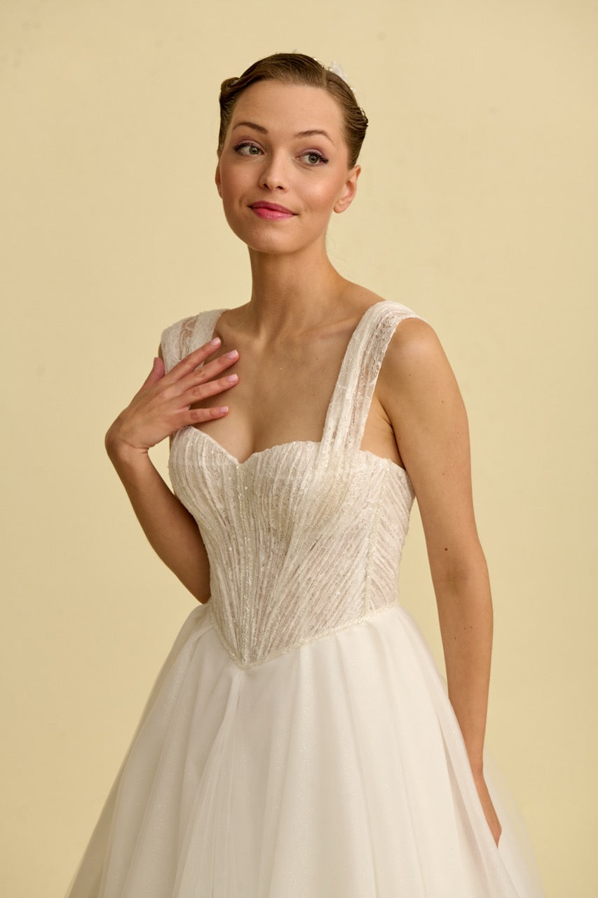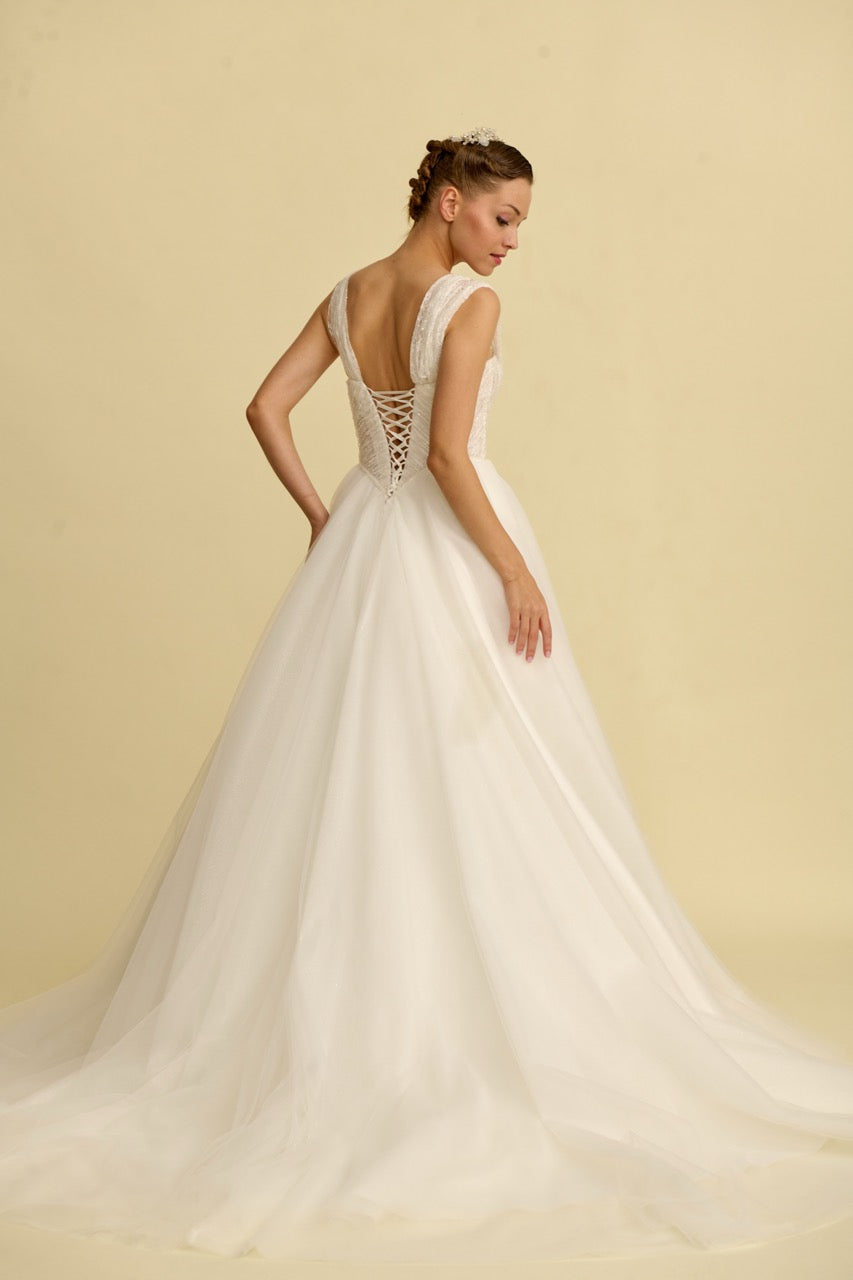 Dantel işlemeli bedeniyle göz kamaştıran bu model, zarif askılarıyla sade bir ihtişam yaratıyor. Klasik güzelliği yansıtan ışıltılı gelinlik modeli.