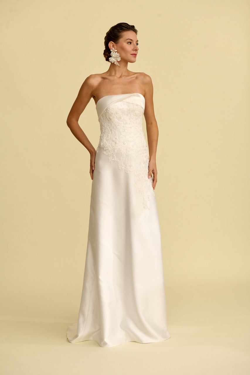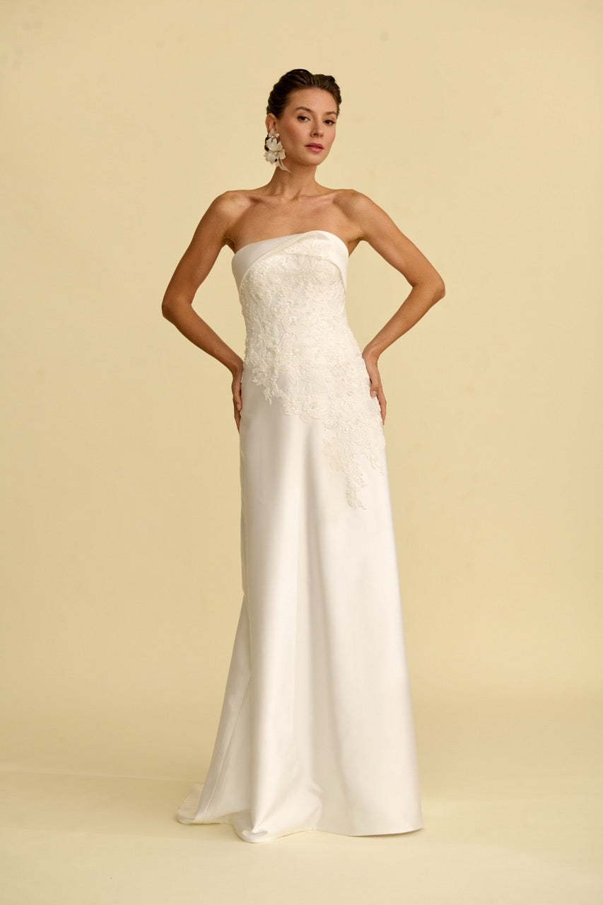 Modern çizgilere sahip bu straplez saten gelinlik modeli, sade ama göz alıcı işlemeleriyle öne çıkan bir tasarım. Minimalist zarafeti seven gelinler için ideal.