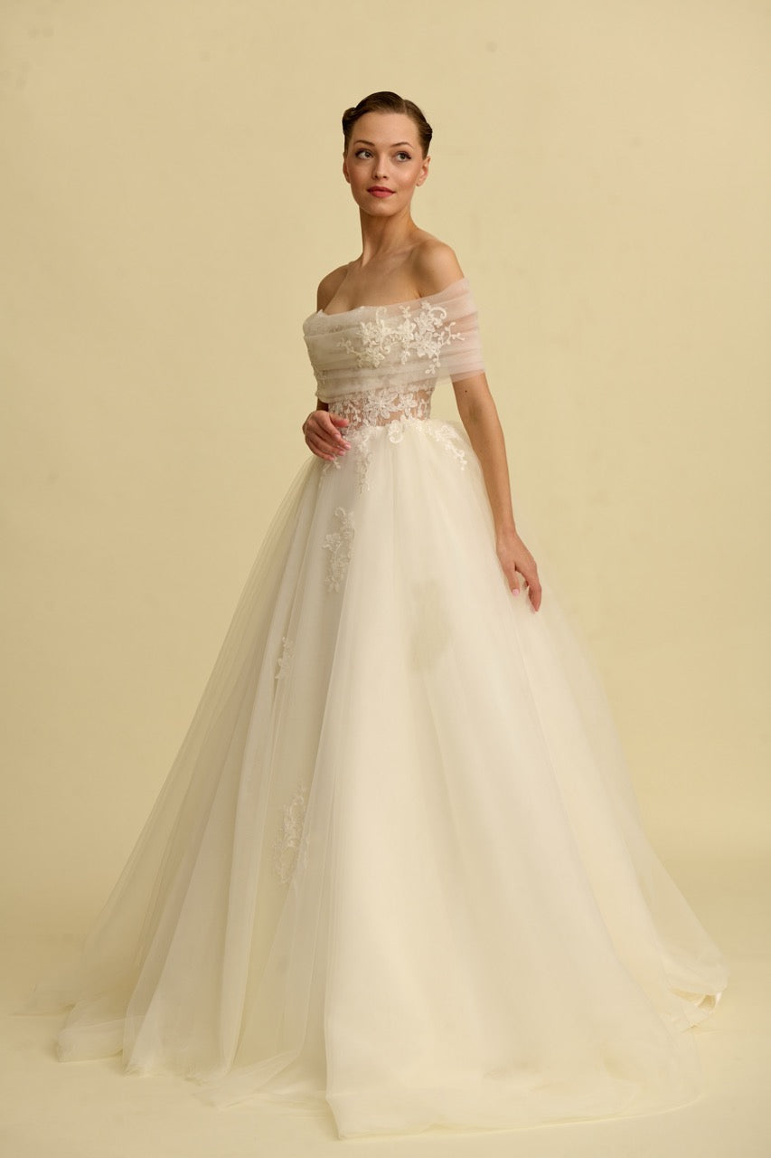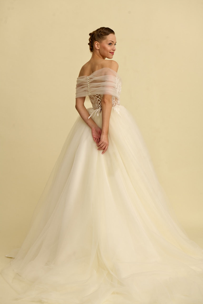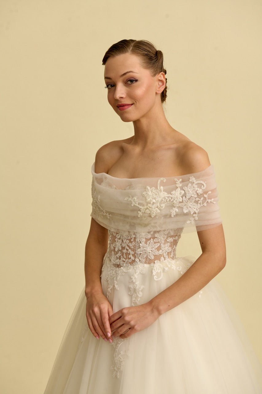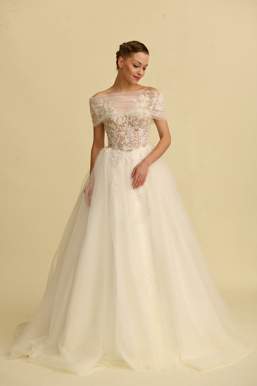 Tül bolerosu ile fark yaratan bu prenses gelinlik modeli, zarif dantellerle bezenmiş romantik bir siluet sunar. Masalsı bir dokunuşla tamamlanmıştır.