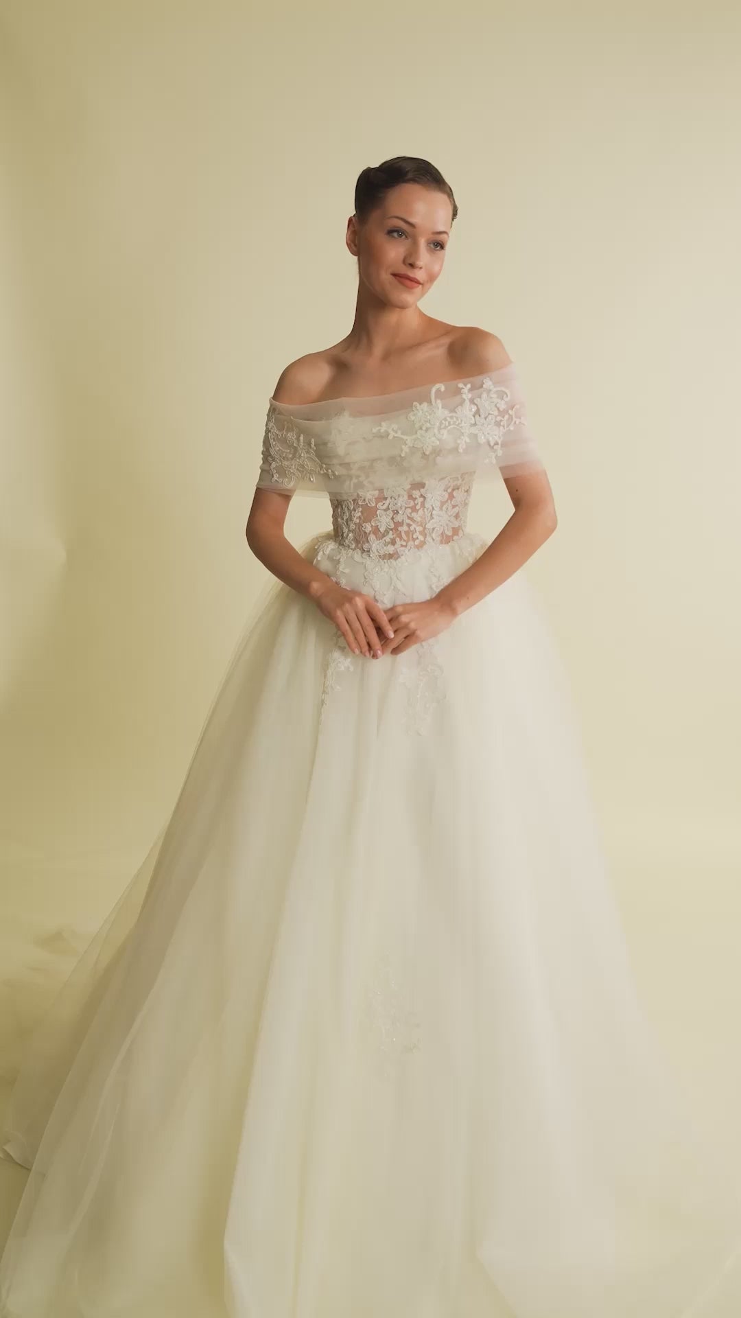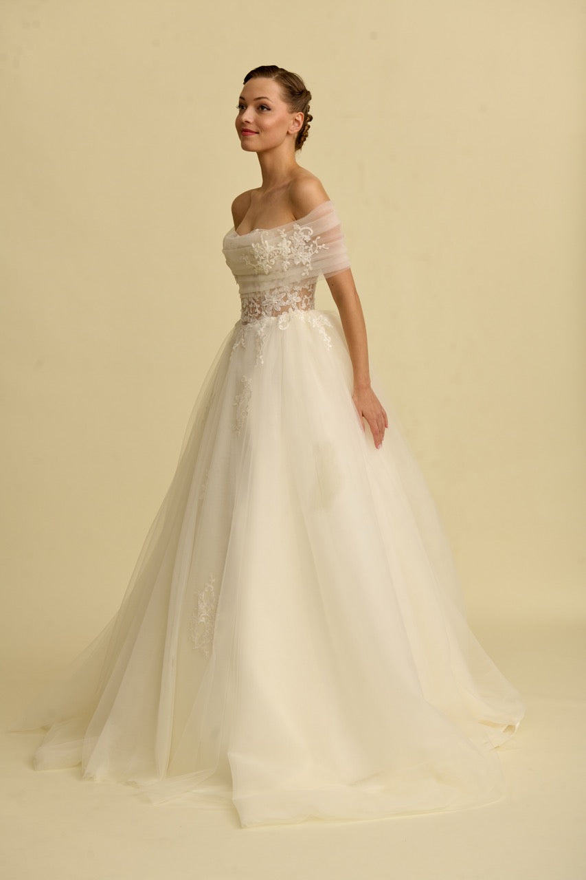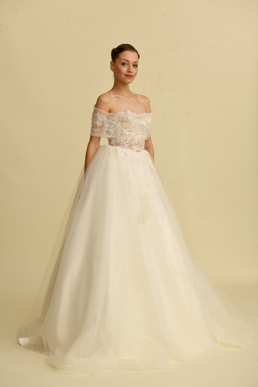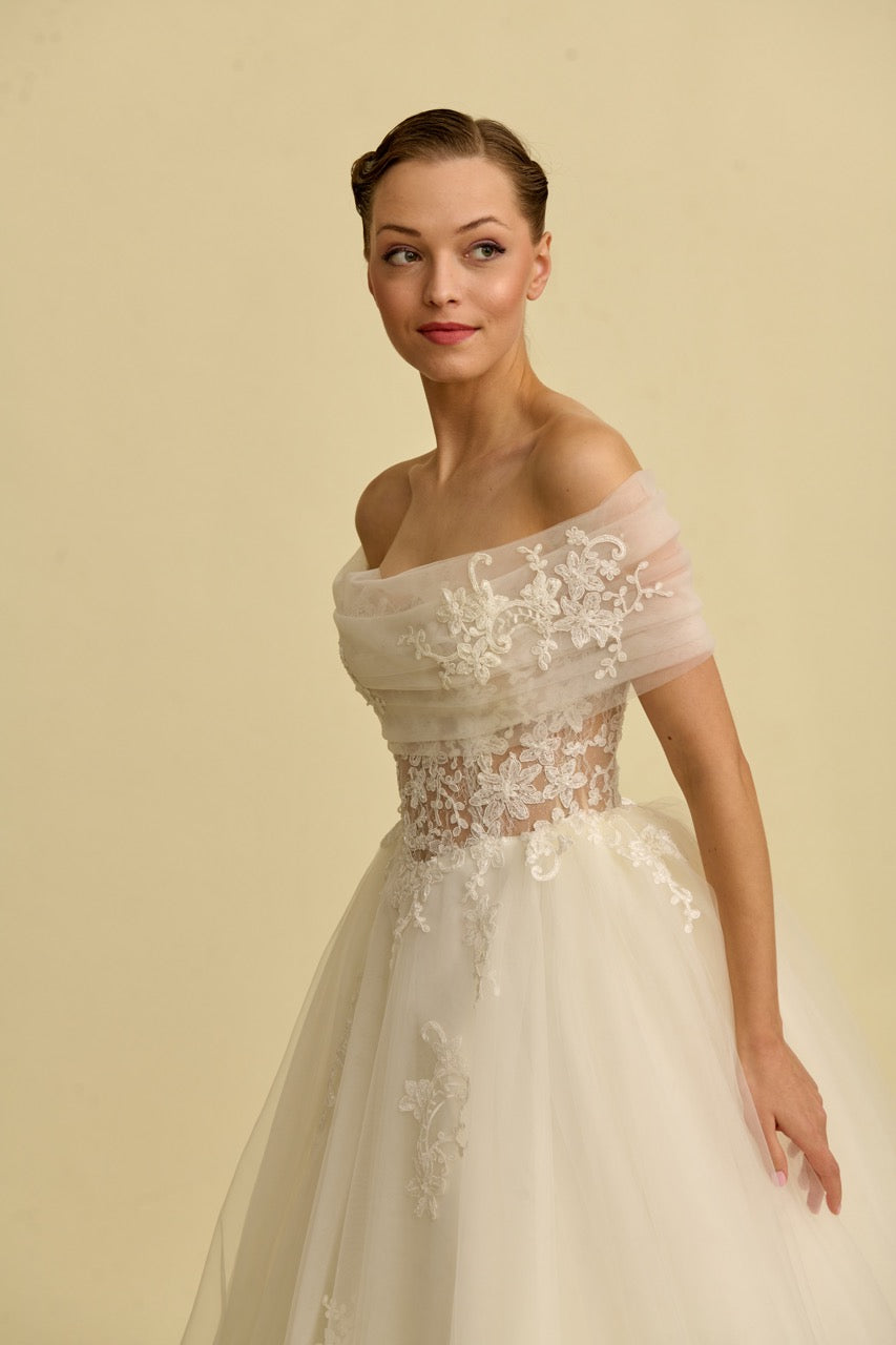Tül bolerosu ile fark yaratan bu prenses gelinlik modeli, zarif dantellerle bezenmiş romantik bir siluet sunar. Masalsı bir dokunuşla tamamlanmıştır.