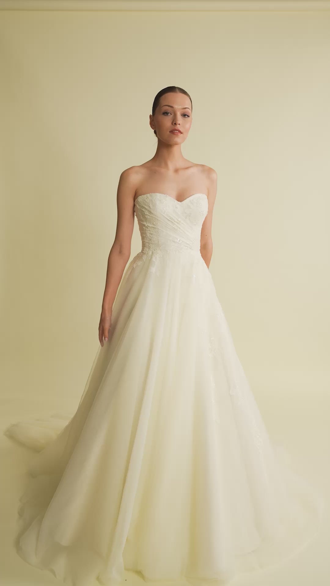 Dantel işlemeli bedeni ve tül eteğiyle zarif bir kontrast oluşturan bu model, romantizmi ve şıklığı aynı anda taşır.
