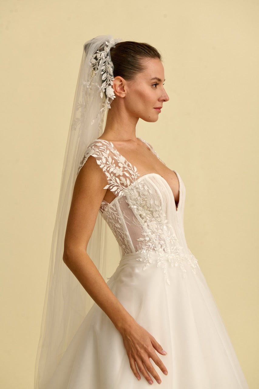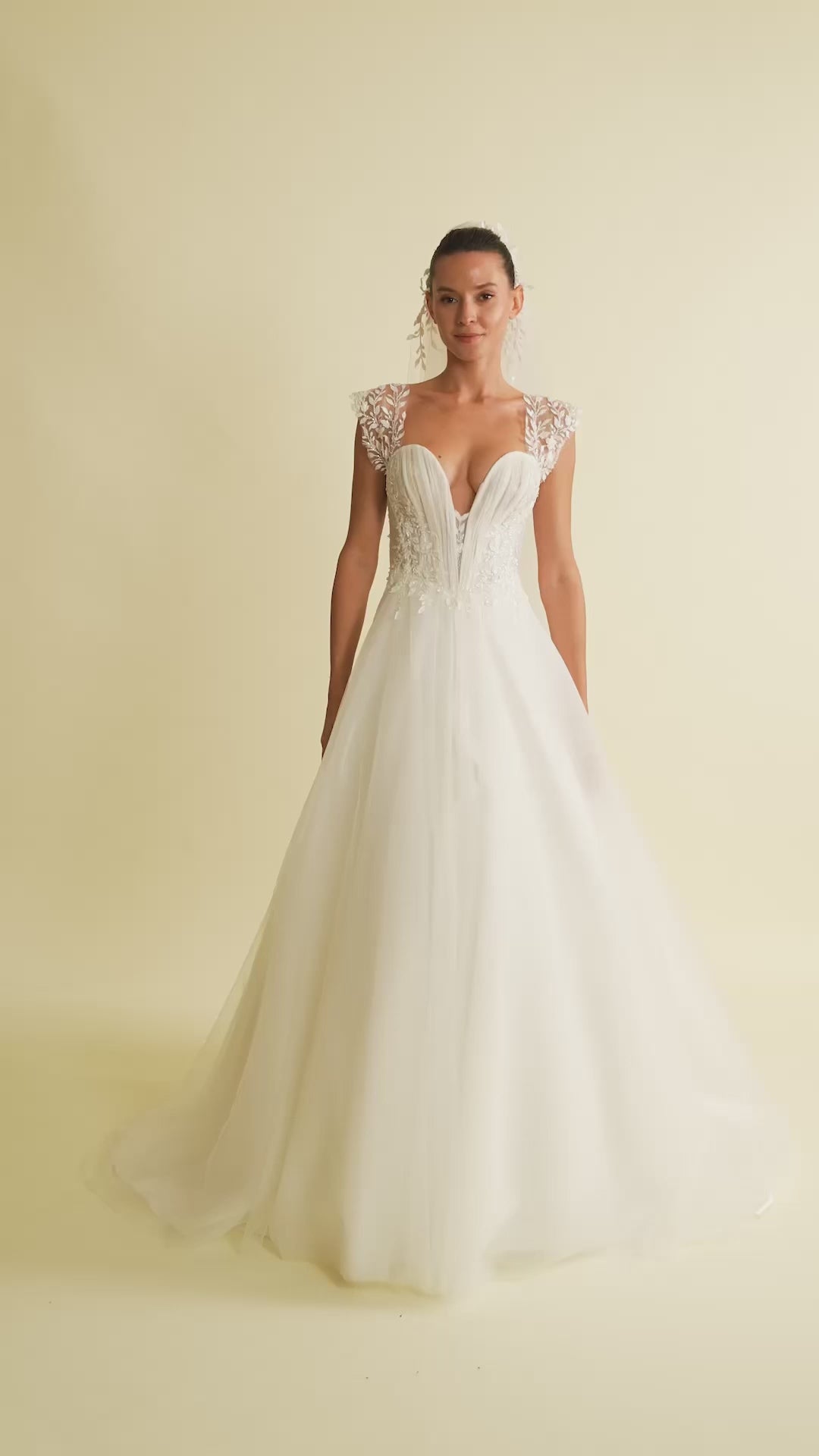 V yaka tasarımıyla modern bir zarafet kazanan bu prenses model, dantel ve tülün büyüleyici birlikteliğini taşır. Masalsı çizgilere sahip prenses gelinlik modeli.
