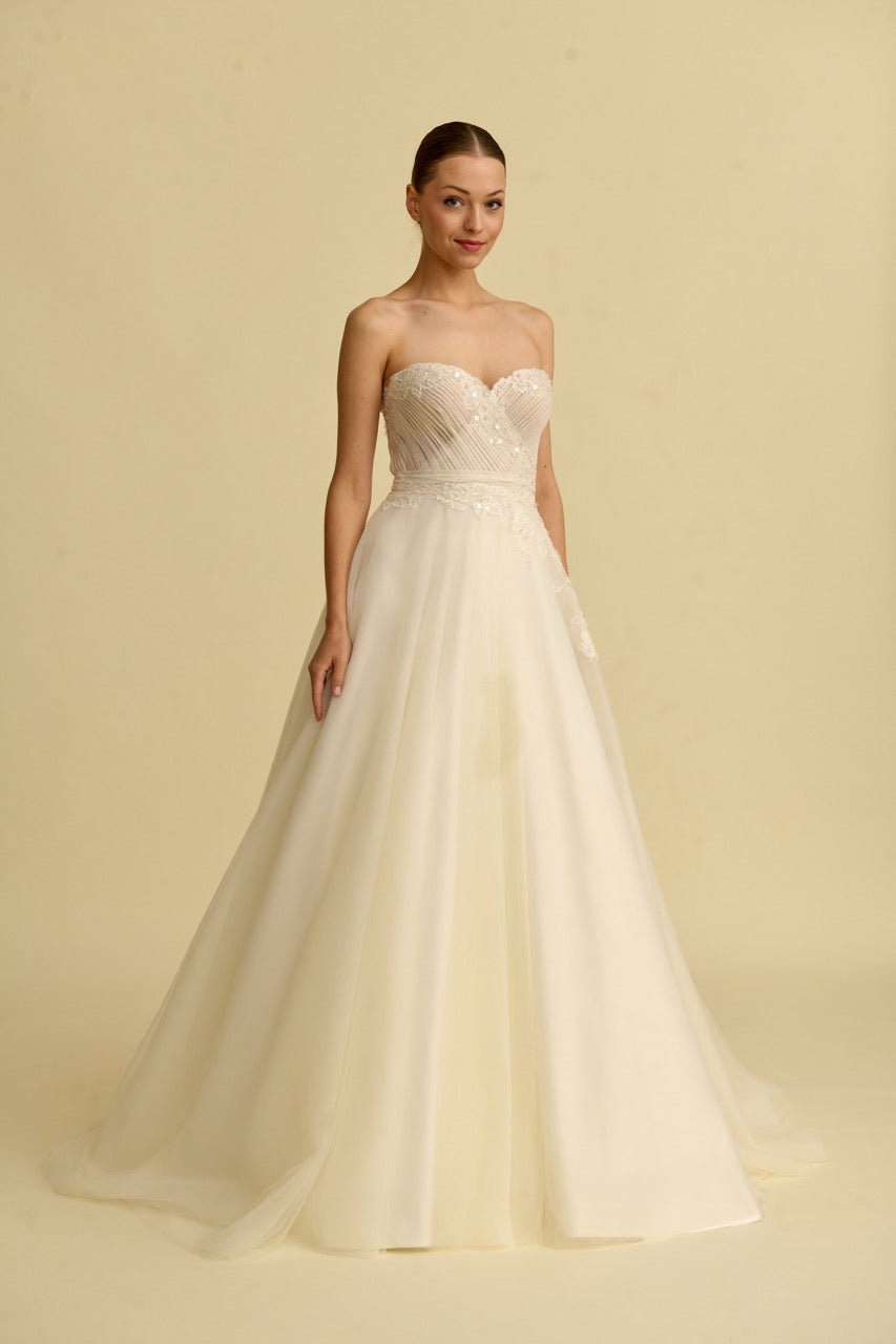 İncelikli zanaatiyle kabarık ve masalsı bir siluet sunan bu prenses model, dantelli detaylarıyla modern bir ihtişama sahip.