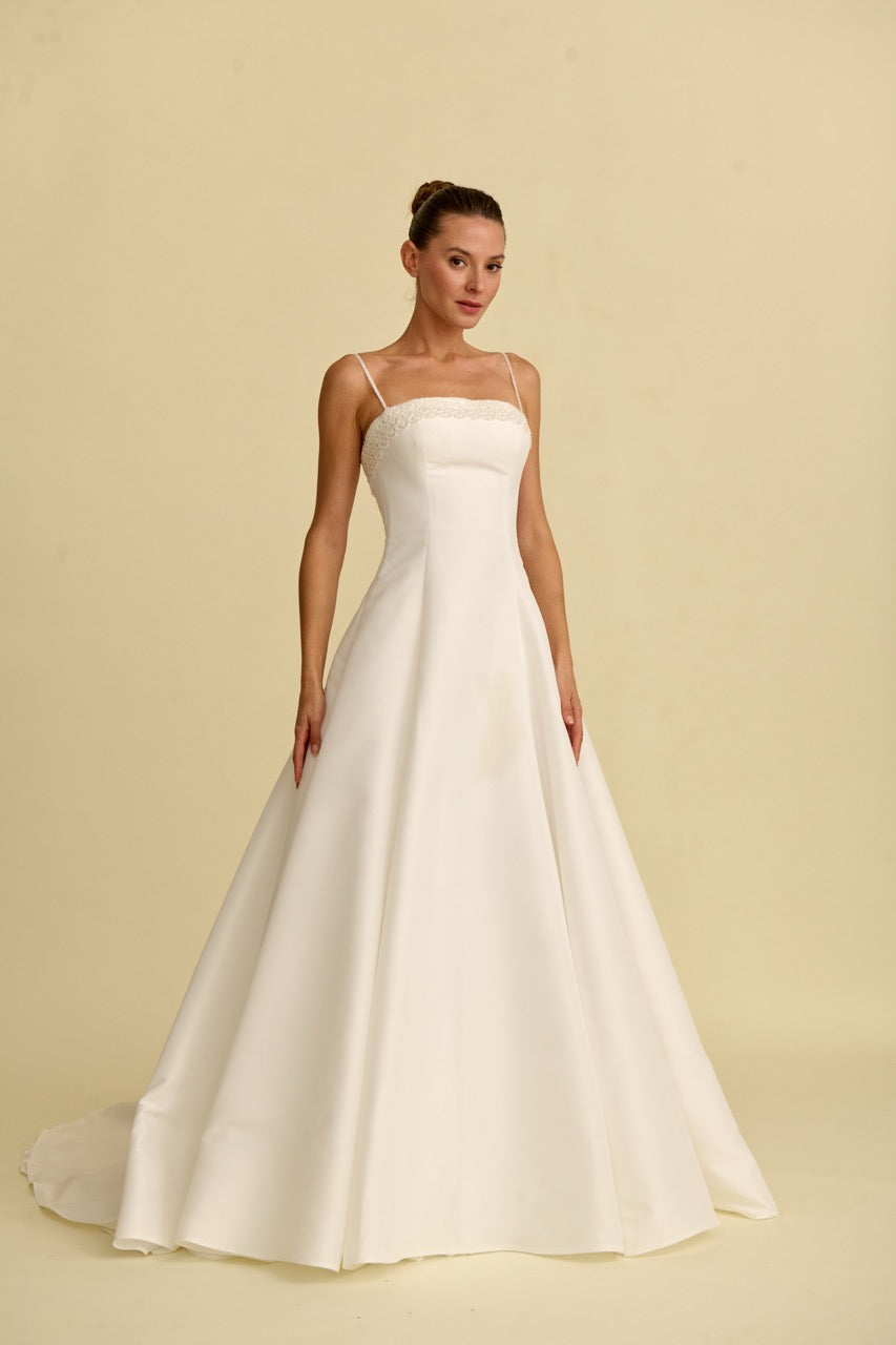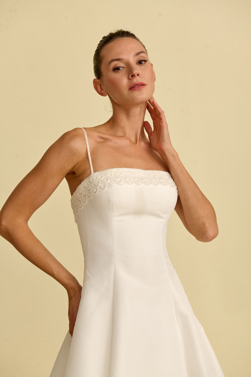 İşlemeli yaka detayıyla farklılaşan bu A kesim model, zarif askıları ve sade formuyla klasik bir zarafete sahip.