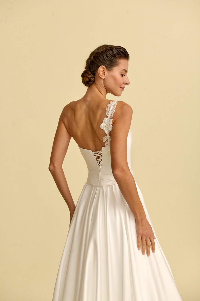 Klasik çizgileriyle masalsı bir ihtişam sunan bu modern A Kesim gelinlik modeli, sade detaylarıyla zamansız bir güzelliğe sahip özel bir tasarım.