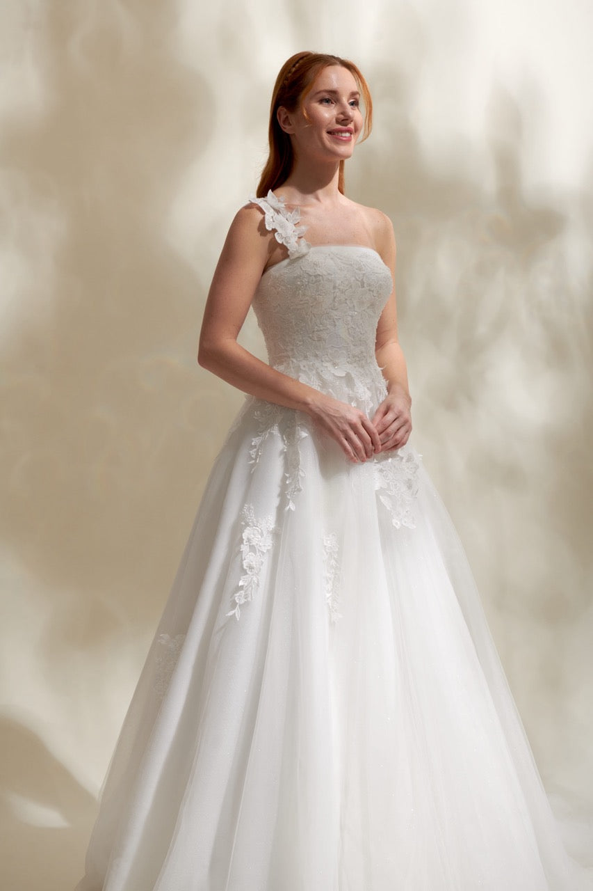 Tek Omuzlu Çiçekli Dantel Gelinlik