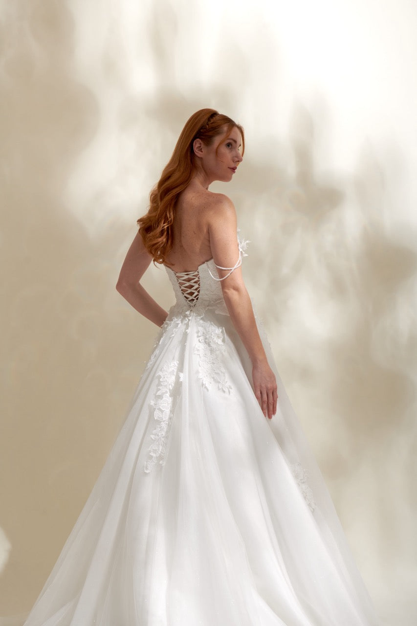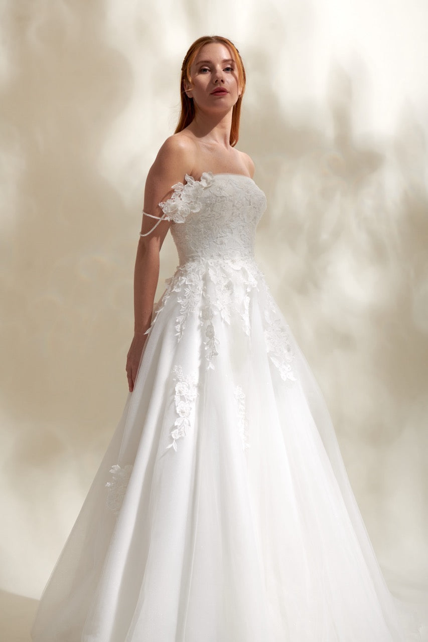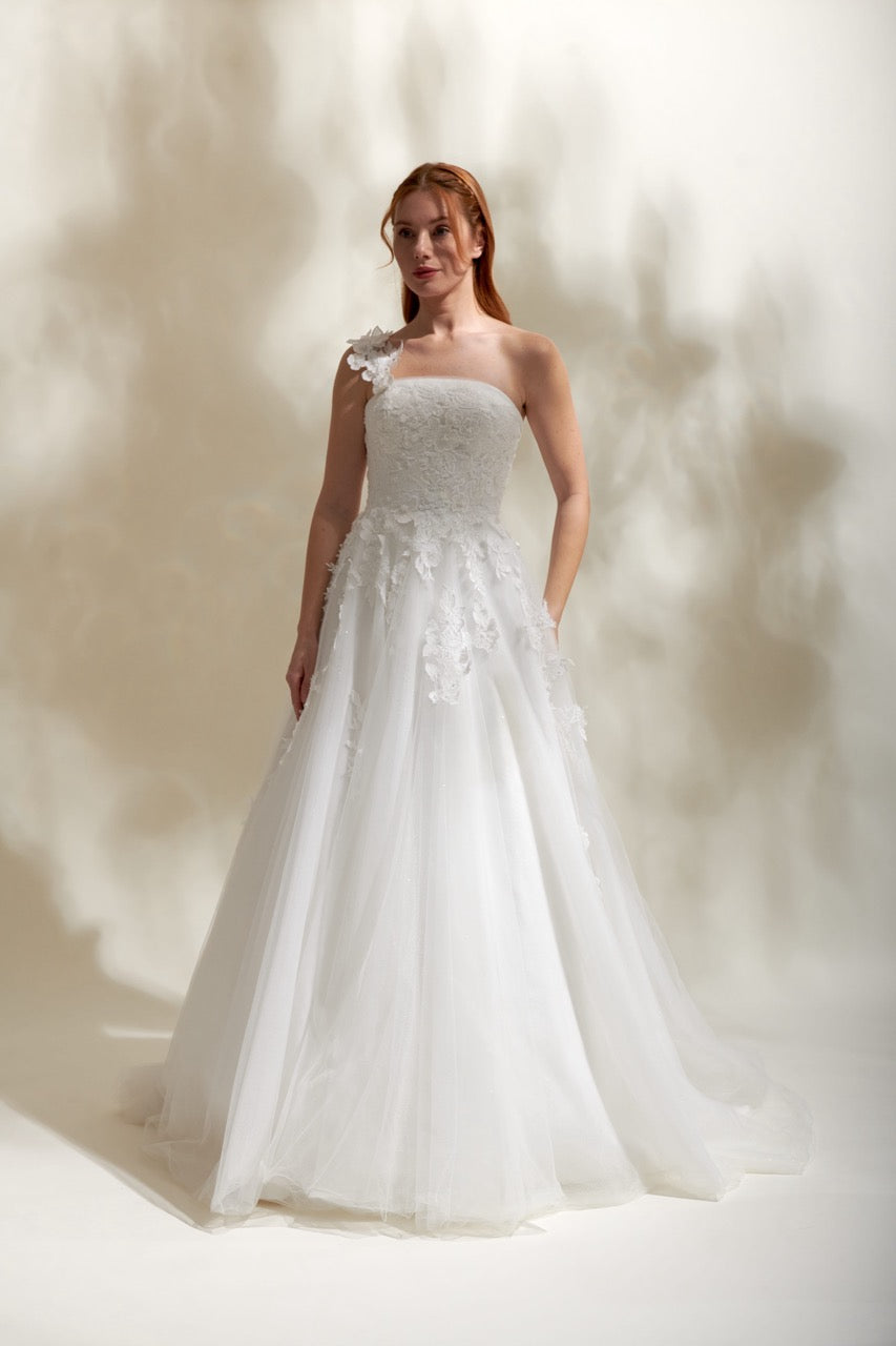 Çiçek danteliyle zarafeti vurgulayan bu tek omuzlu gelinlik, modern çizgilerle birleşen asil bir stil sunar. Omuz detayının yarattığı özgün silüet sayesinde dikkat çeken bu gelinlik modeli, zarif dantel işlemeleriyle romantik bir görünüm kazandırır. Tek omuzlu gelinlik tasarımları arasında öne çıkan bu model, şık ve modern bir gelinlik arayan gelin adayları için ideal bir tercihtir.