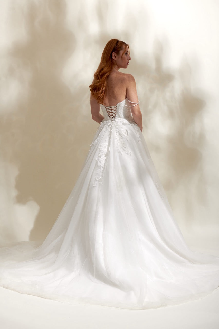 Akay kabarık prenses gelinlik modeli, hacimli tül etek ve romantik dantel detaylarıyla tasarlanmış gösterişli prenses kesim düğün gelinliği