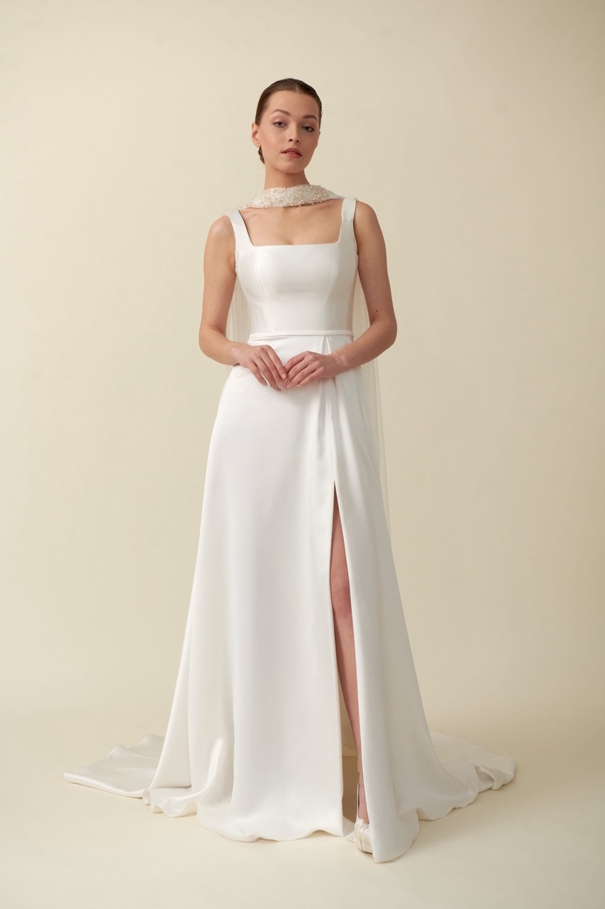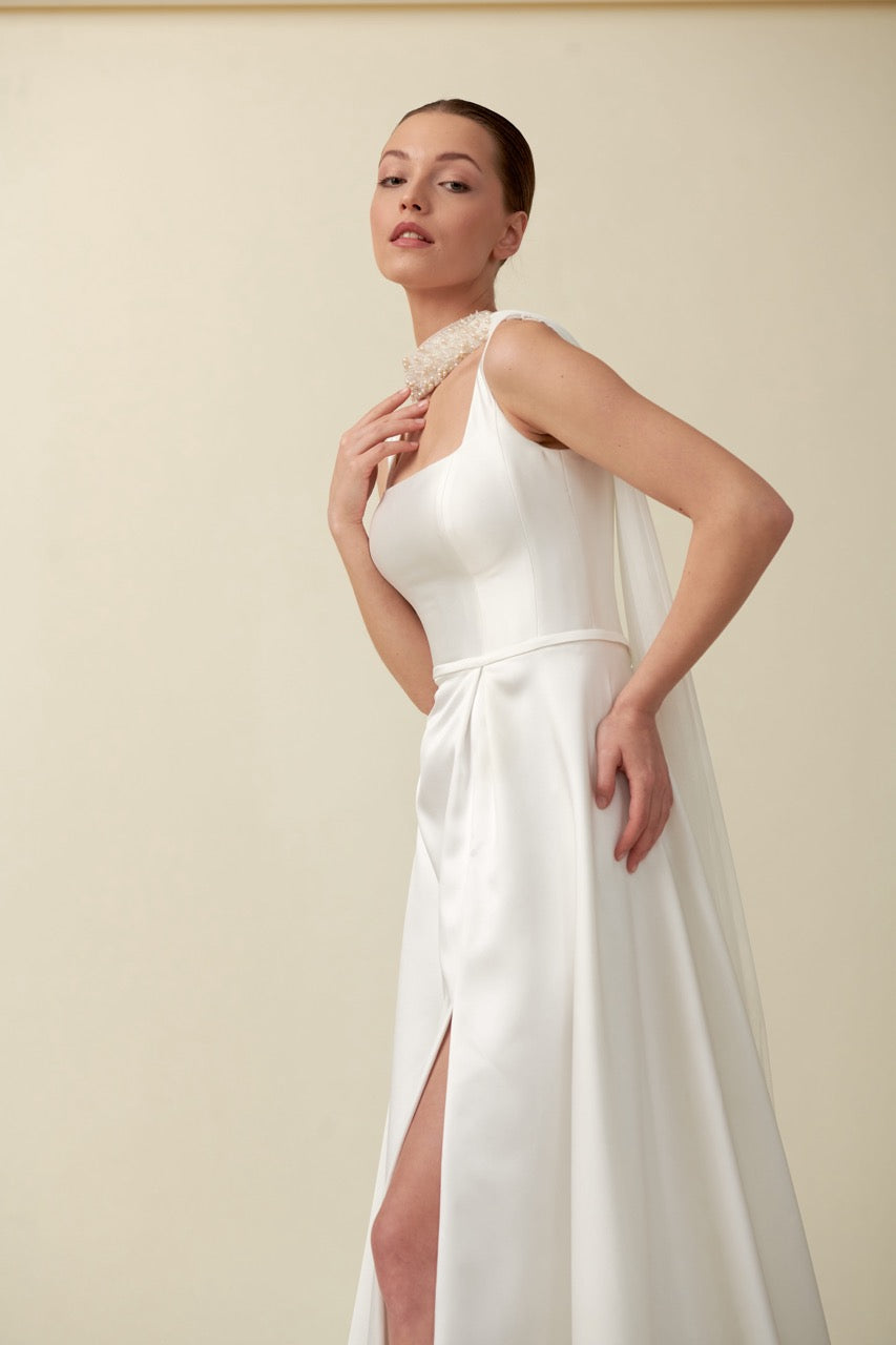 Saten kumaşın yumuşak dokusu ve kare yaka kesiminin zarif duruşuyla tasarlanan bu helen balık gelinlik modeli, klasik estetikten ilham alan akıcı silüetiyle dikkat çeker. Minimal ve sofistike tasarım çizgileri gelinliğe hem modern hem de zamansız bir karakter kazandırırken, saten kumaşın doğal ışıltısı zarafeti ön plana çıkarır. Zarif ve sade bir helen gelinlik arayan gelin adayları için tasarlanmış özel bir gelinlik modelidir.