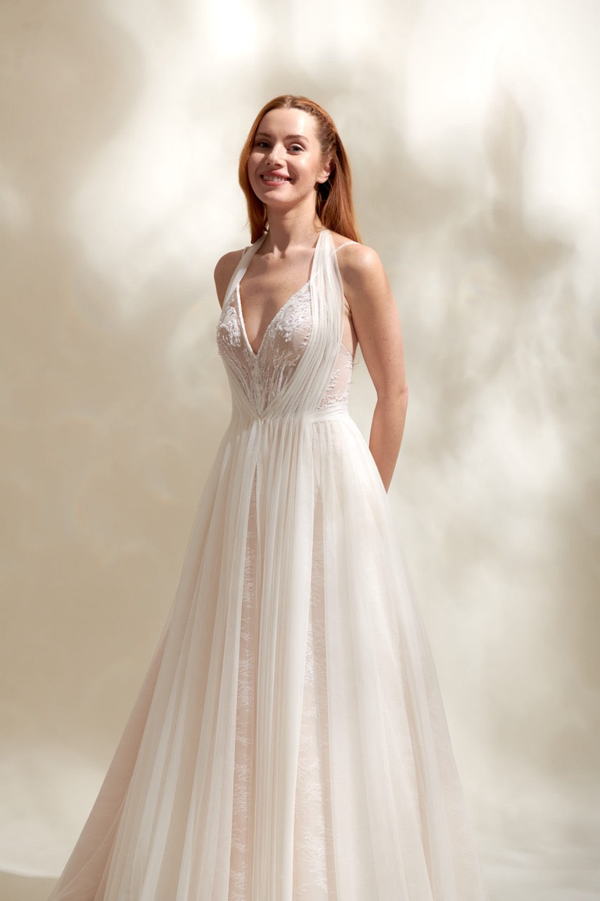 Çiçek desenleri ve ince dantel işçiliğiyle tasarlanan bu bohem gelinlik modeli, romantik ve doğal bir görünüm arayan gelin adayları için zarif bir seçenektir. Bohem gelinlik modelleri arasında öne çıkan bu tasarım, hafif yapısı ve estetik detaylarıyla düğün gününde özgün bir stil sunar.