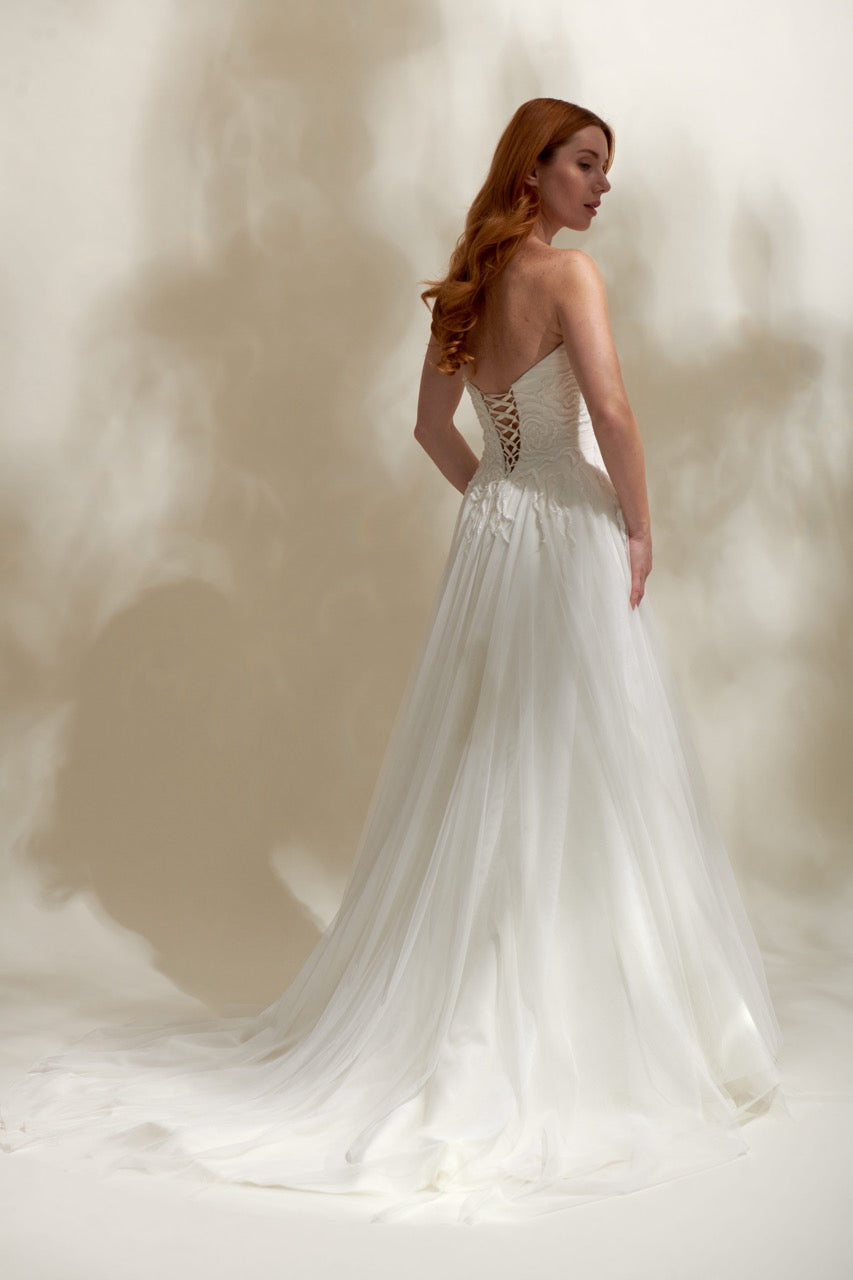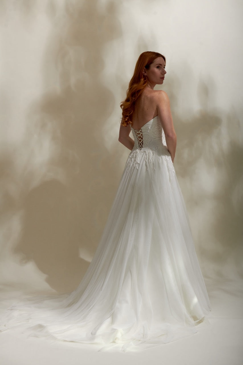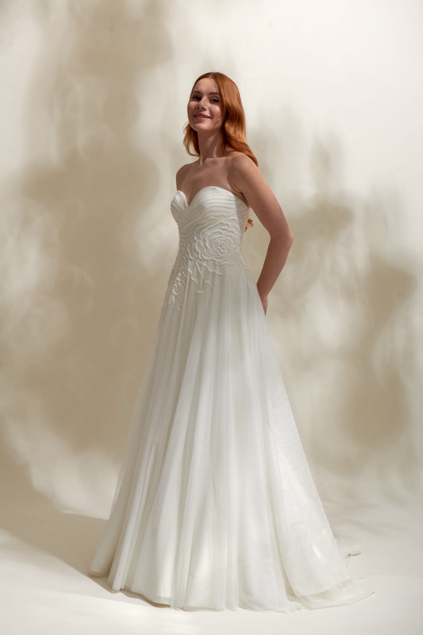 Modern ve şık tasarım çizgileriyle öne çıkan bu straplez gelinlik modeli, zarif silüeti ve özenli işçiliğiyle dikkat çeker. Straplez kesimi omuzları ve dekolteyi zarif şekilde vurgularken, dengeli tasarım detayları gelinliğe hem sofistike hem de modern bir karakter kazandırır. Şık ve etkileyici bir gelinlik arayan gelin adayları için tasarlanmış özel bir gelinlik modelidir.