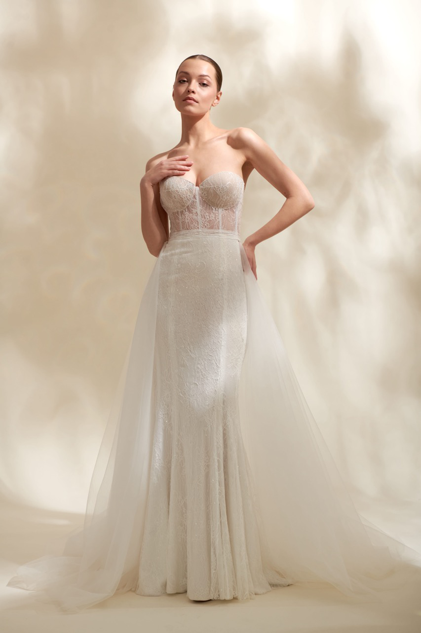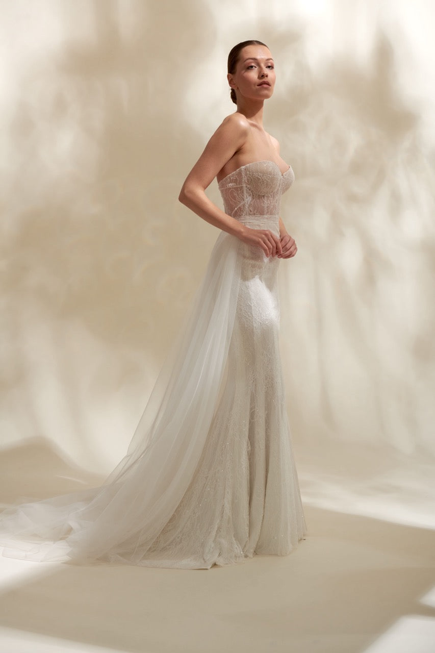Özgün tasarım anlayışıyla hazırlanan bu straplez balık gelinlik modeli, zarif dantel işlemeleri ve vücuda oturan silüetiyle dikkat çeker. Straplez kesimi omuzları ve dekolteyi zarif şekilde vurgularken, balık kesim formu gelinliğe modern ve sofistike bir karakter kazandırır. İnce işçilikle hazırlanan dantel detayları tasarımın şık ve etkileyici duruşunu ön plana çıkarır.