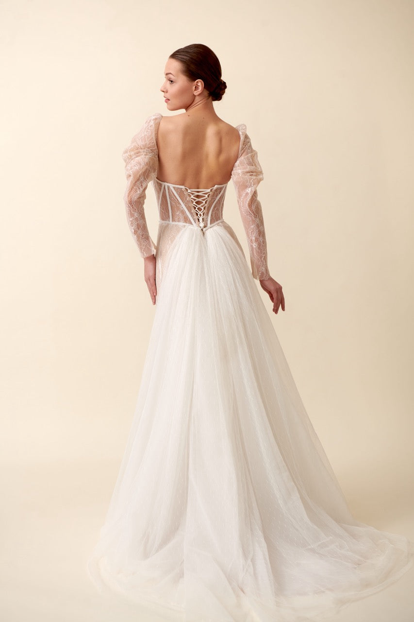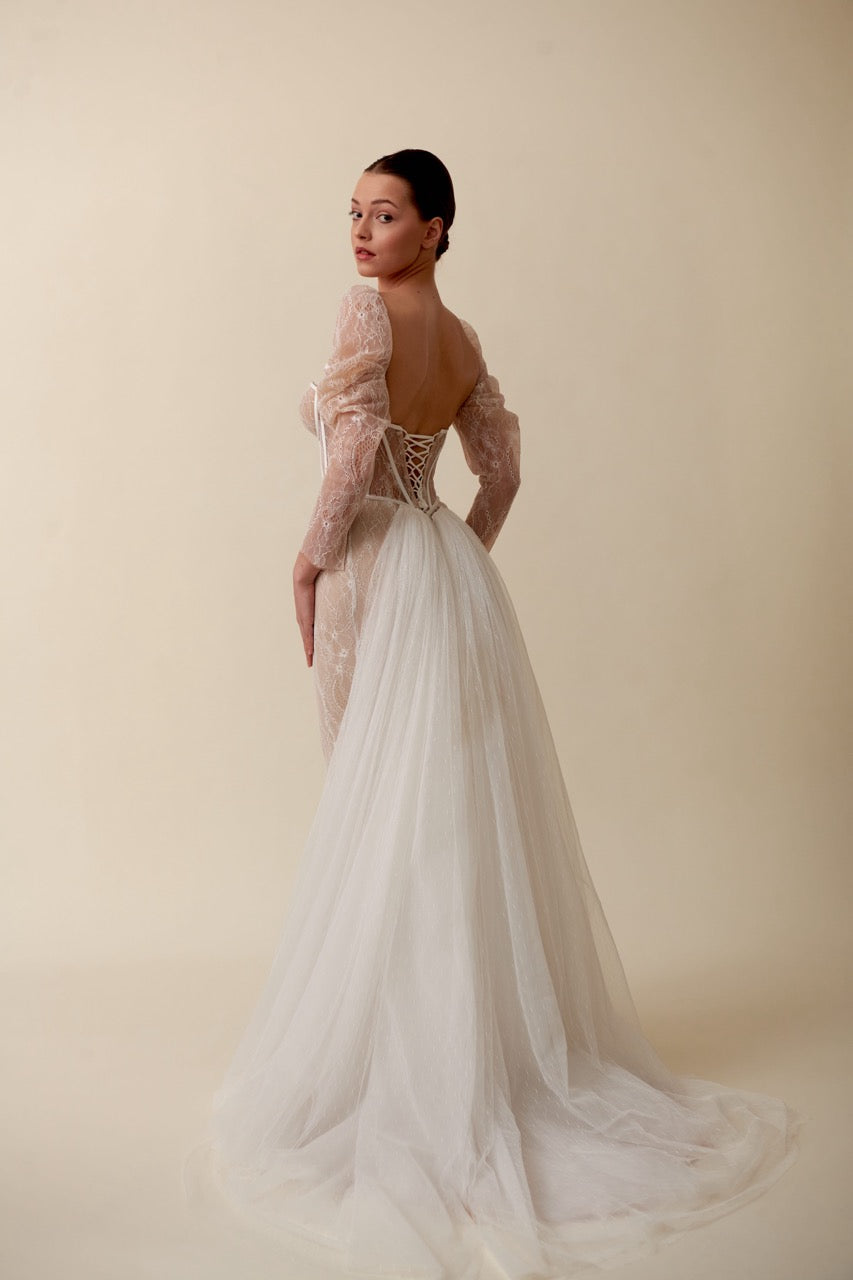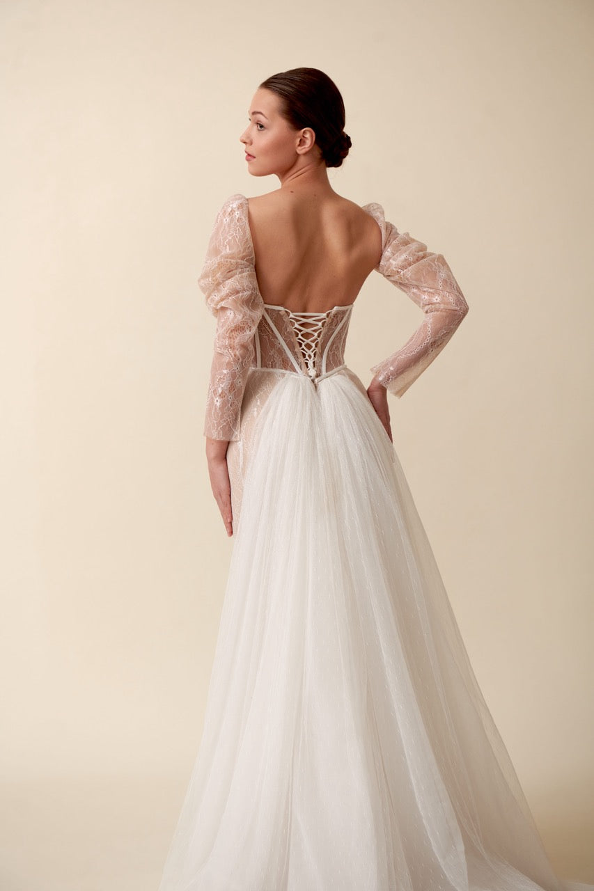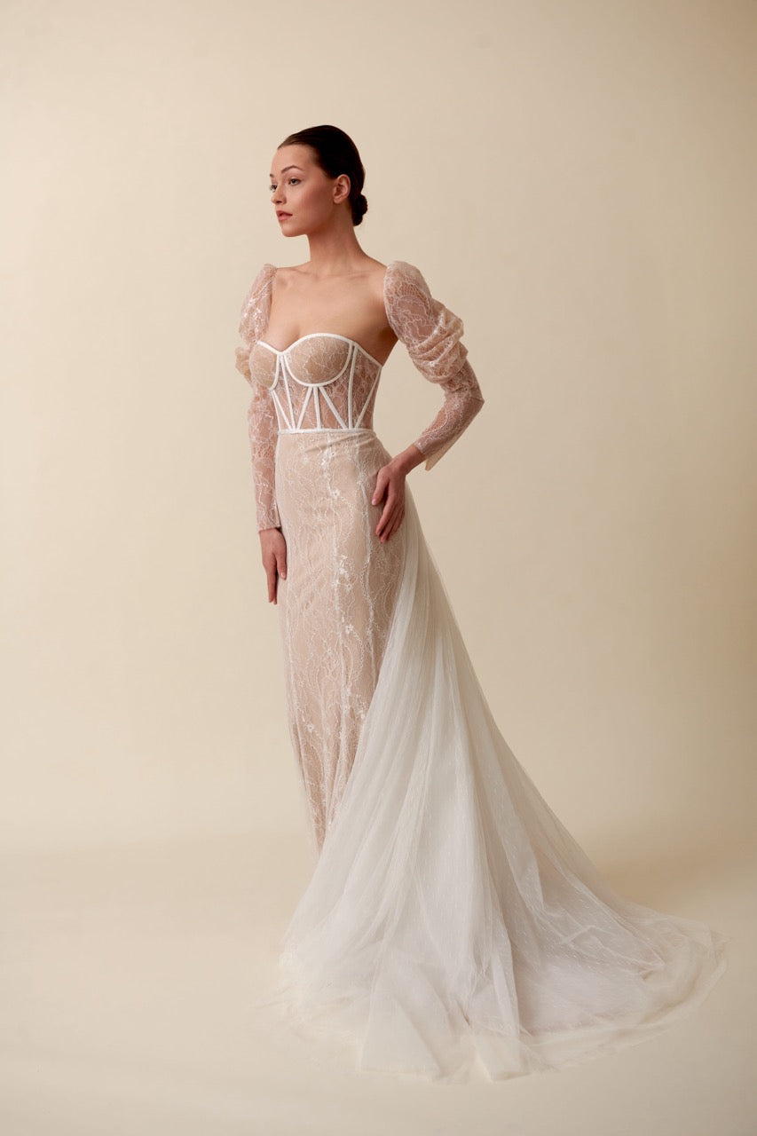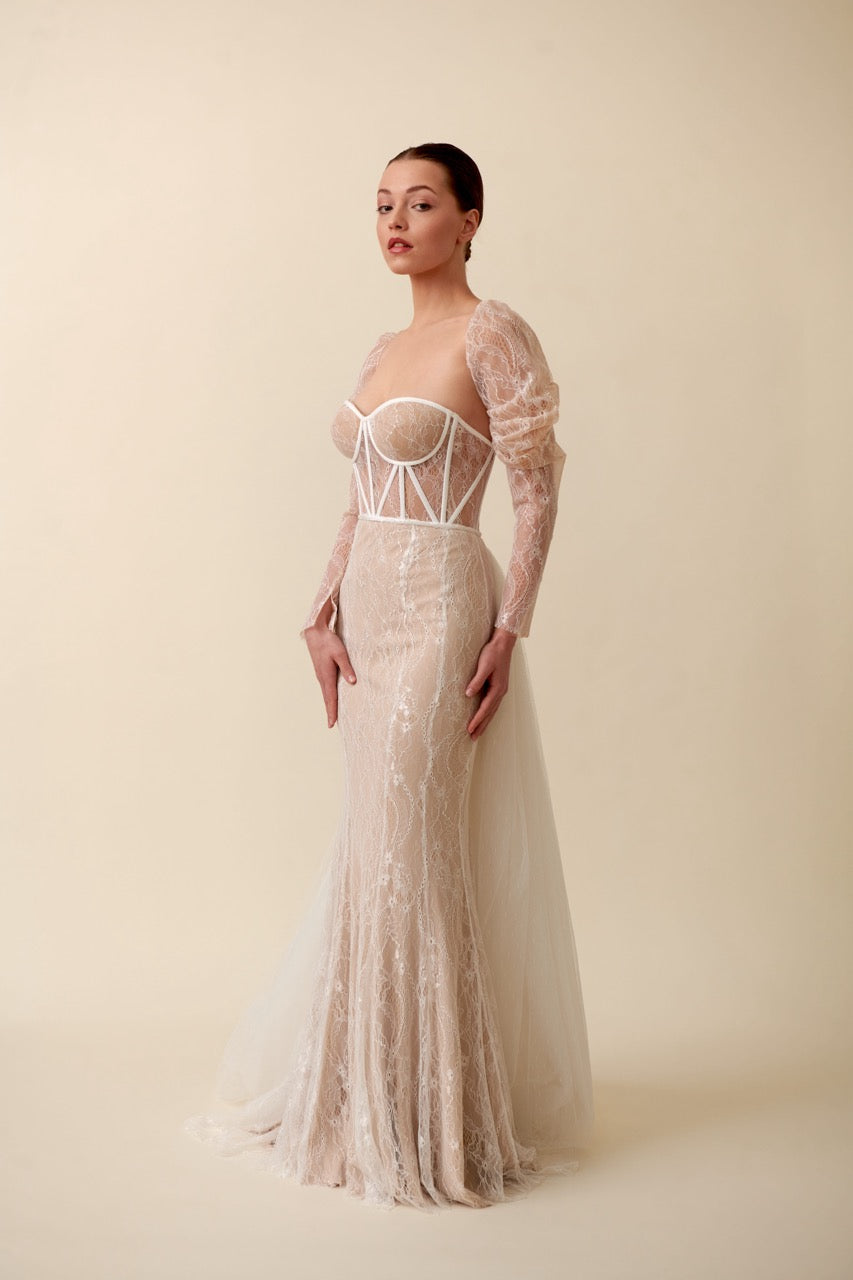Modern zarafetin izlerini taşıyan bu balık gelinlik modeli, sade ama etkileyici tasarım çizgileri ve akıcı silüetiyle dikkat çeker. Vücut hatlarını zarif şekilde vurgulayan balık kesim formu gelinliğe hem sofistike hem de görkemli bir karakter kazandırırken, minimal detayları modern gelinlik estetiğini ön plana çıkarır. Şık ve zarif bir balık gelinlik arayan gelin adayları için tasarlanmış özel bir gelinlik modelidir.