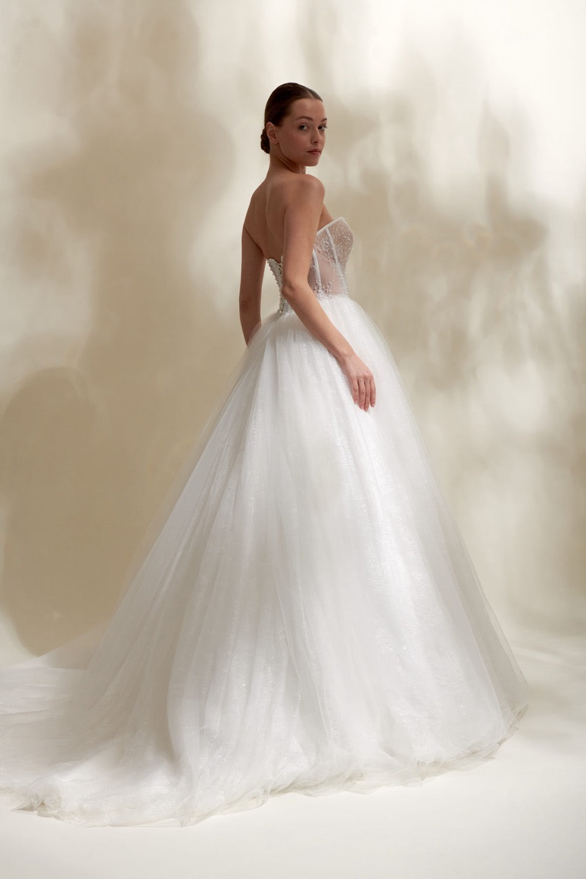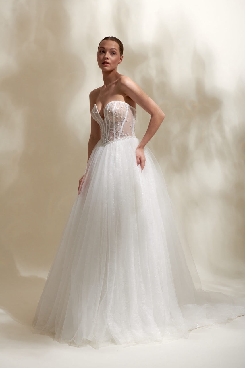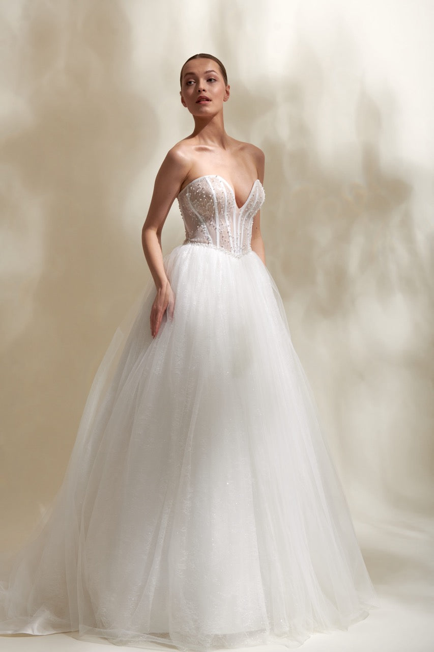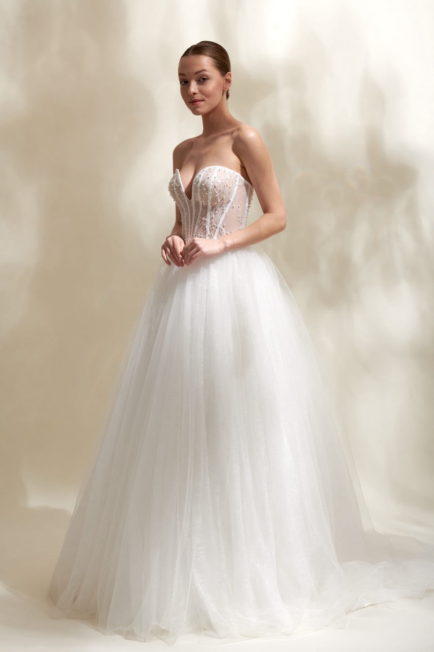 Modern zarafeti yansıtan bu straplez gelinlik modeli, minimal detaylarla sade ama etkileyici bir şıklık sunar. Straplez kesimi omuzları ve dekolteyi zarif şekilde vurgularken, akıcı silüeti gelinliğe sofistike ve modern bir karakter kazandırır. Minimalist tasarım anlayışıyla hazırlanan bu model, zarif ve göz alıcı bir gelinlik arayan gelin adayları için özel olarak tasarlanmıştır.
