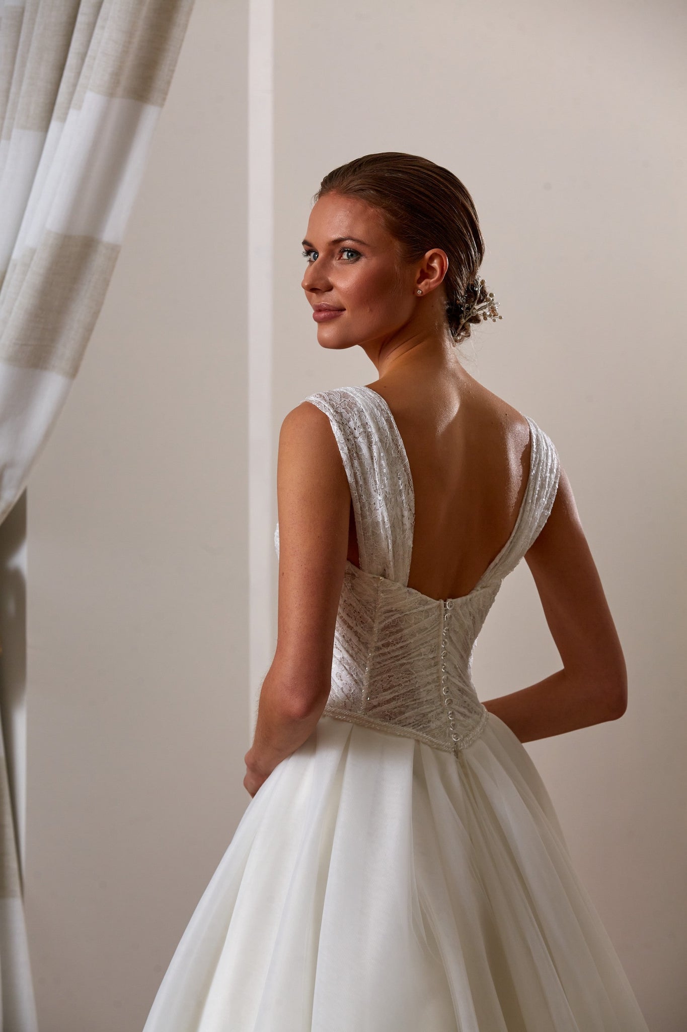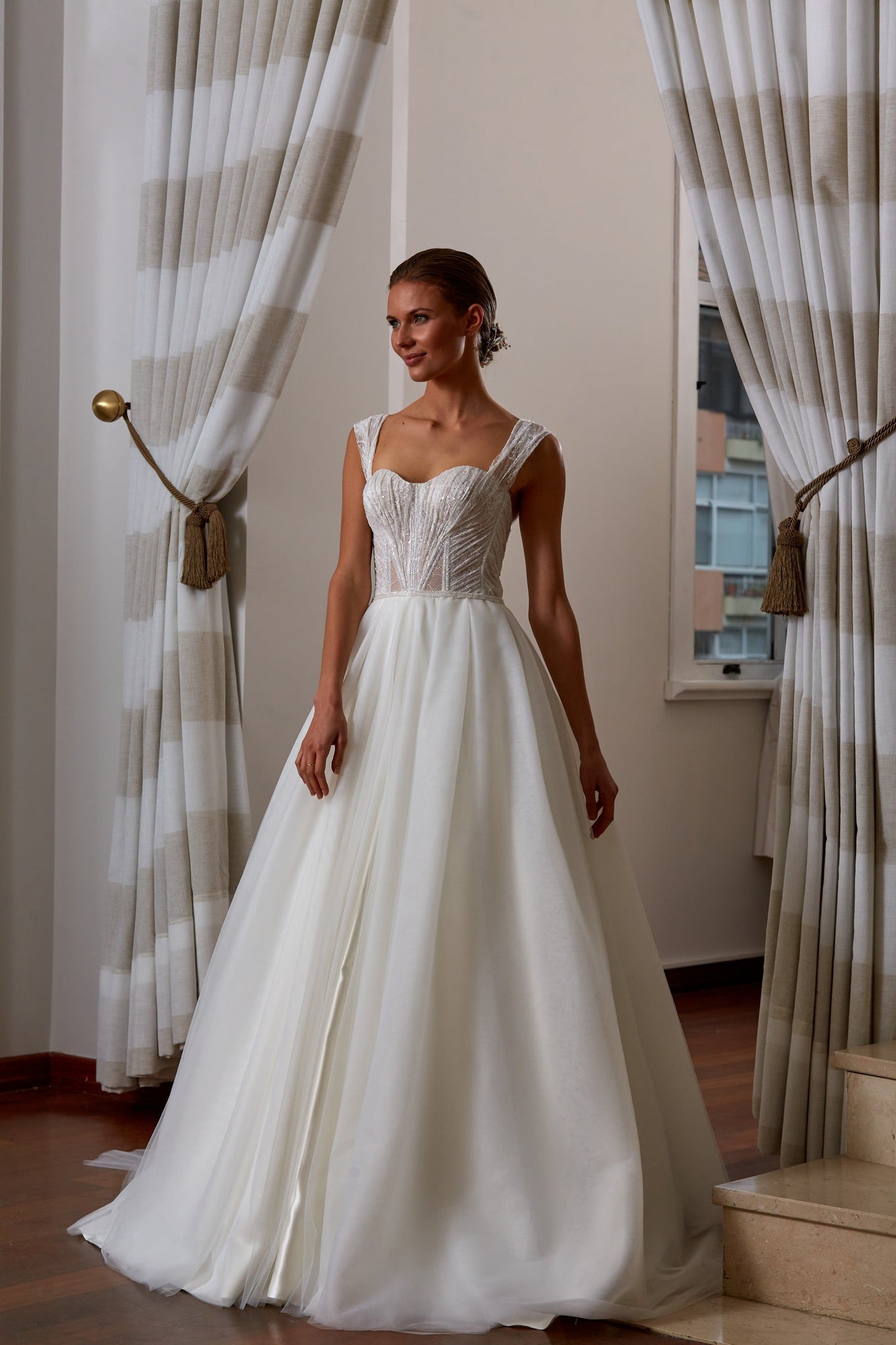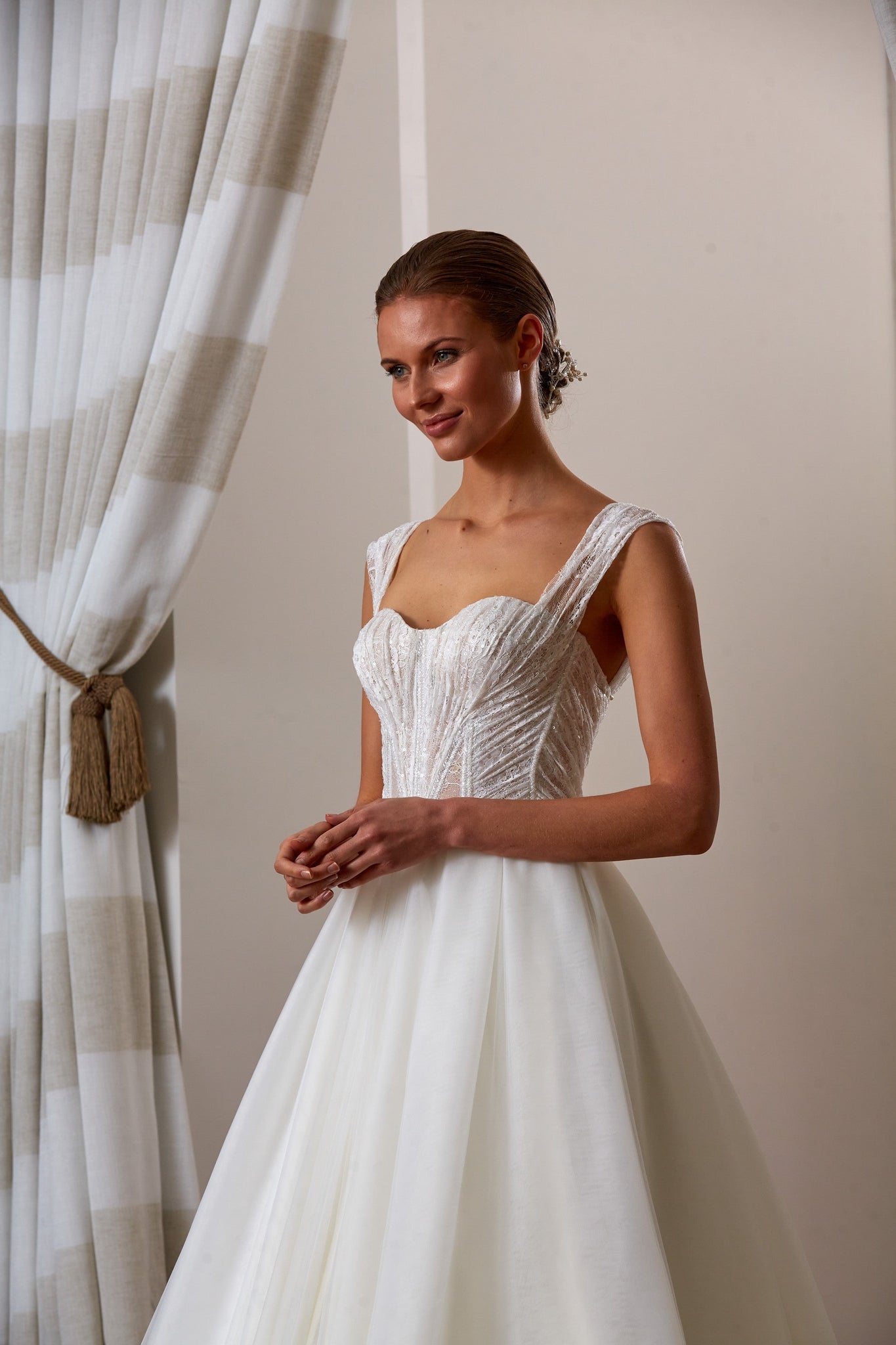 Beden çizgileriyle modern bir silüet sunan bu A kesim gelinlik, dantelin romantik dokusunu zarif detaylarla buluşturur. Işıltılı ve özenli işçiliğiyle dikkat çeken bu gelinlik modeli, zarafeti ve şıklığı bir arada sunar. A kesim gelinlik modelleri arasında öne çıkan bu tasarım yalnızca AKAY Wedding House Köşkü’nde sergilenmektedir.