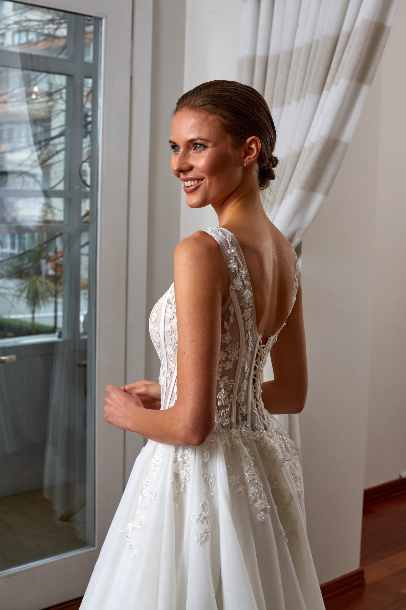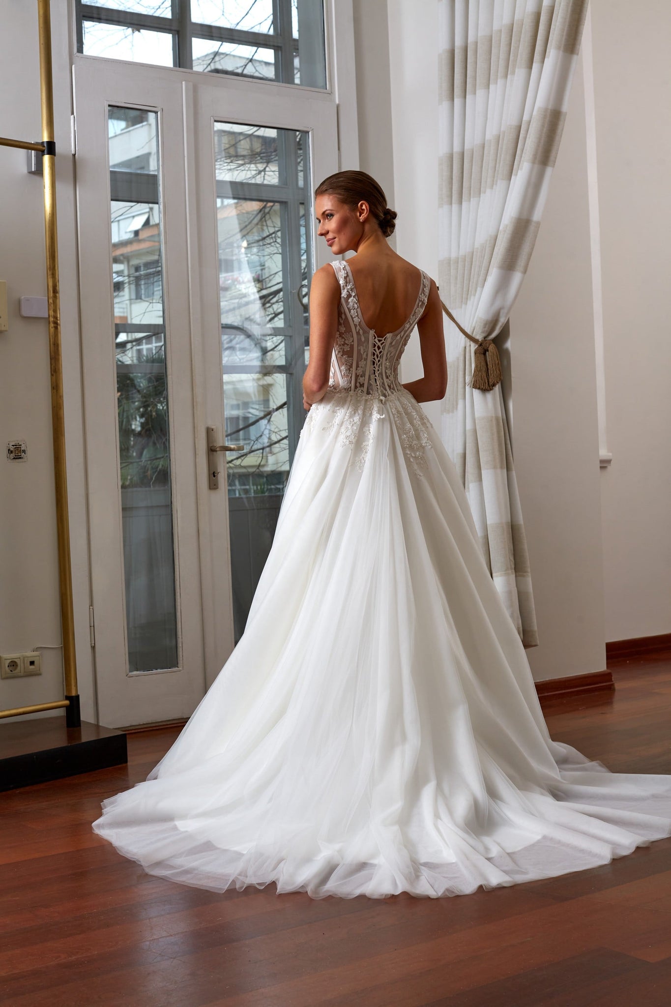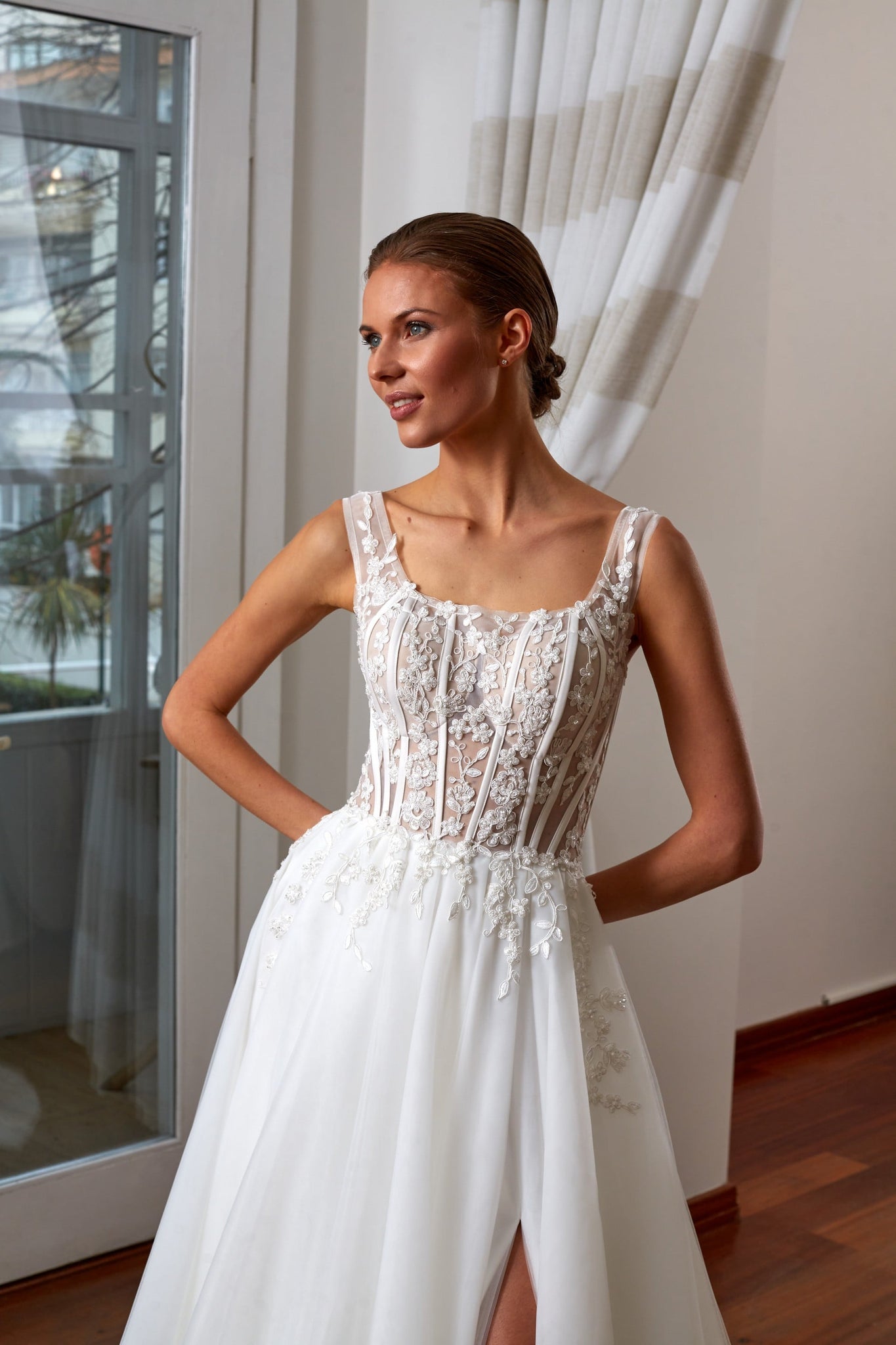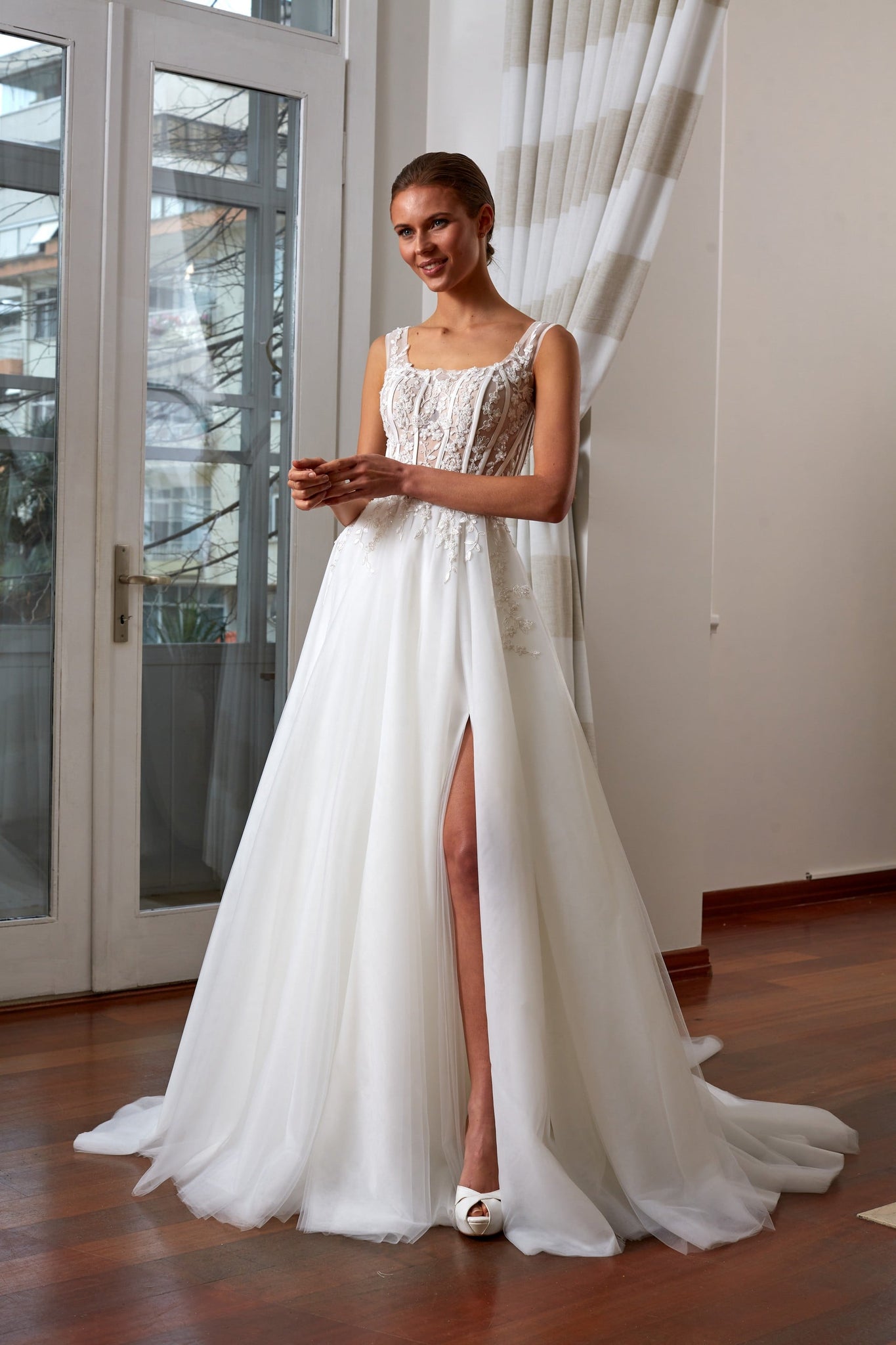 Geleneksel çizgileri modern bir yorumla buluşturan bu A kesim gelinlik, çarpıcı ve zarif bir görünüm sunar. Çiçek motiflerinin naifliğiyle asaleti yansıtan bu gelinlik modeli, beden kısmındaki özenli detaylarıyla güçlü bir tasarım karakteri ortaya koyar. A kesim gelinlik modelleri arasında dikkat çeken bu tasarım, romantik ve dengeli bir silüet arayan gelin adayları için ideal bir seçimdir.