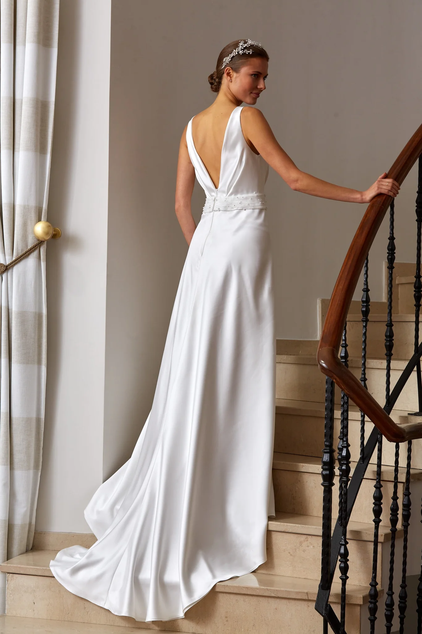 Özgür ve asil bir duruşu yansıtan bu tasarım, duruluğun zarafetini hareketli ve akıcı formuyla bir araya getiriyor. Modern çizgileri ve estetik detaylarıyla dikkat çeken çalışma, sade ama etkileyici bir görünüm arayan gelin adayları için özenle tasarlanmıştır. İncelikle kurgulanan silüeti ve zarif dokusuyla her adımda sofistike bir etki yaratan bu tasarım, düğün gününde özgün bir stil sunar. Zamansız şıklığı ve dengeli formuyla öne çıkan bu özel tasarım, gelinlik modeli.