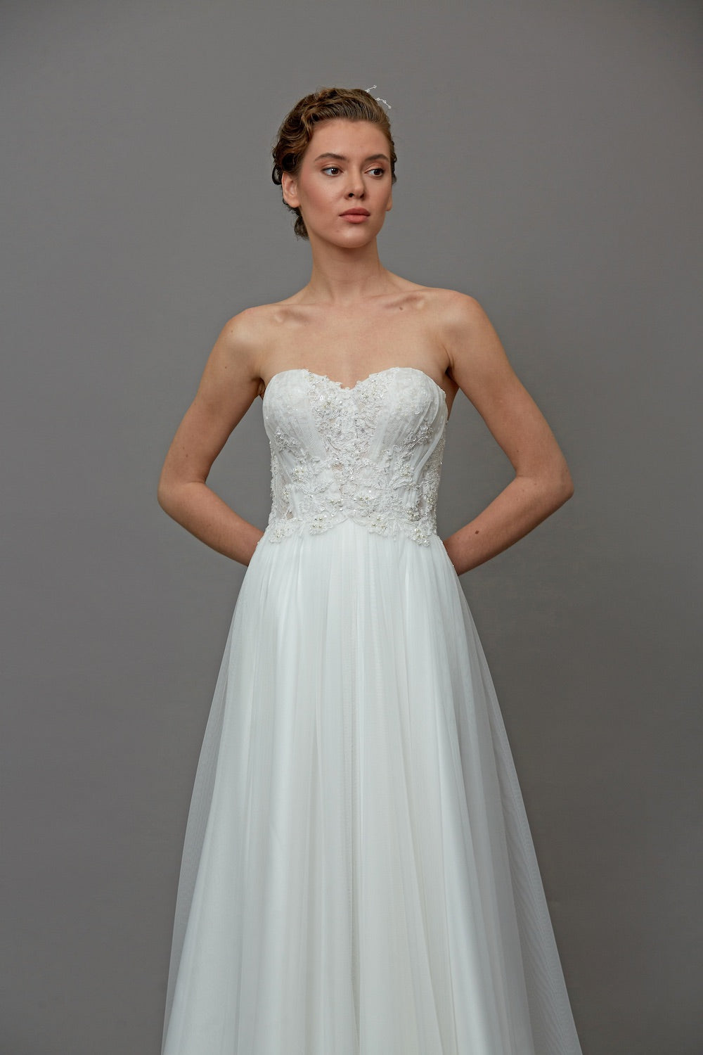 İşlemeli dantel ve hareketli tülün zarif birleşimiyle tasarlanan bu straplez gelinlik modeli, ışıltılı dantel detayları ve akıcı silüetiyle göz alıcı bir görünüm sunar. Straplez kesimi omuzları ve dekolteyi zarif şekilde vurgularken, ince işçilikle hazırlanan detaylar gelinliğe hem romantik hem de sofistike bir karakter kazandırır. Şık, zarif ve etkileyici bir gelinlik arayan gelin adayları için tasarlanmış özel bir gelinlik modelidir.