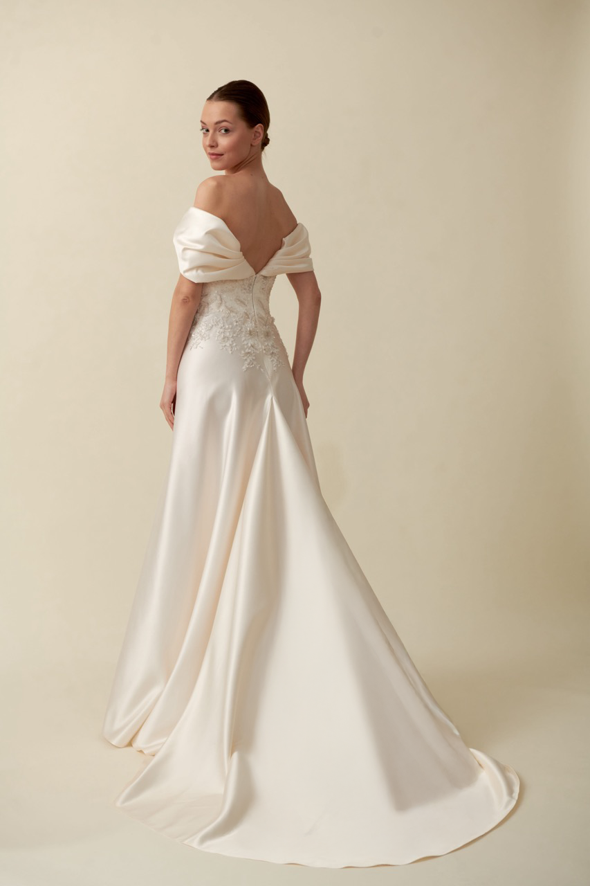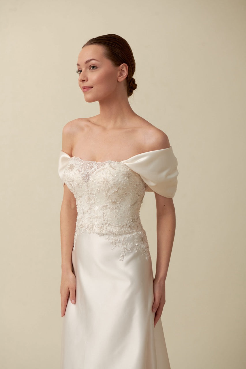 Narin tasarım çizgileriyle büyüleyici bir silüet sunan bu helen gelinlik modeli, klasik estetiği modern detaylarla bir araya getirerek zamansız bir görünüm oluşturur. Akıcı formu ve zarif tasarım dokunuşları gelinliğe hem romantik hem de sofistike bir karakter kazandırırken, helenistik kesimi doğal ve elegant bir duruş sağlar. Geleneksel gelinlik anlayışını modern bir yorumla aşan bu model, zarif ve etkileyici bir gelinlik arayan gelin adayları için tasarlanmıştır.