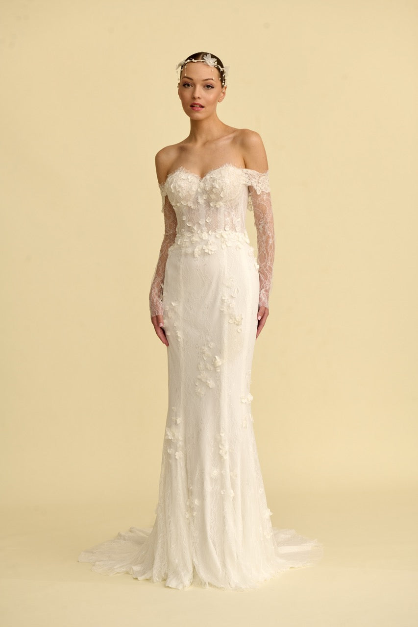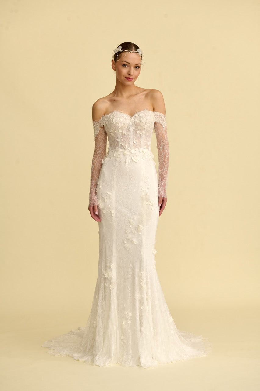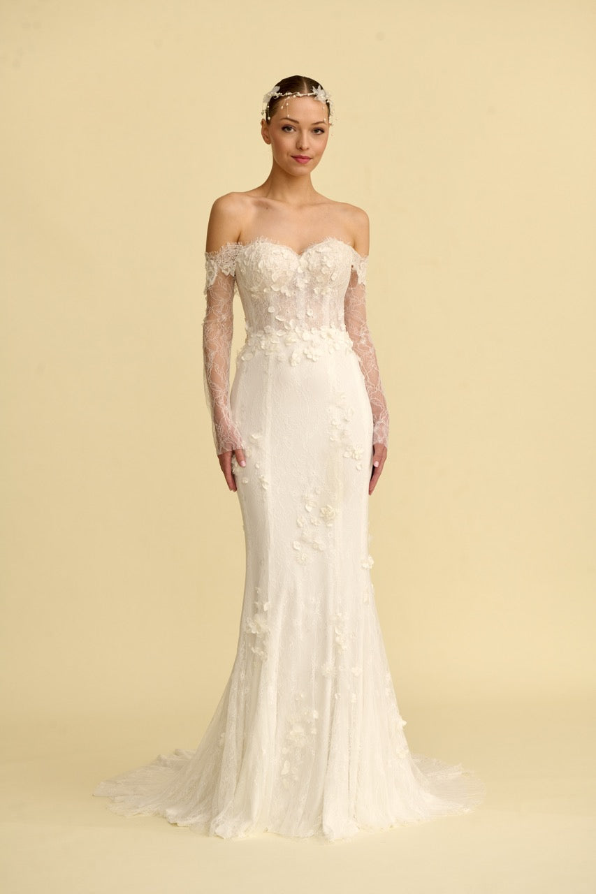 Narin detaylarıyla öne çıkan bu balık gelinlik modeli, zarif dantel işlemeleriyle romantik bir zarafet sunar. Vücut hatlarını ön plana çıkaran balık kesim formu ve prenses yaka detayı gelinliğe hem modern hem de ihtişamlı bir karakter kazandırır. İnce işçilikle hazırlanan detayları sayesinde sofistike ve etkileyici bir görünüm sunan bu model, zarif ve iddialı bir balık gelinlik arayan gelin adayları için tasarlanmıştır.
