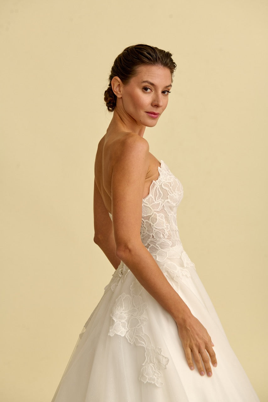 Çiçek motifli dantellerle bezenmiş bu prenses model, doğadan ilham alan romantik bir zarafet sunar. Straplez tasarımıyla modern bir masalın kapılarını aralar.