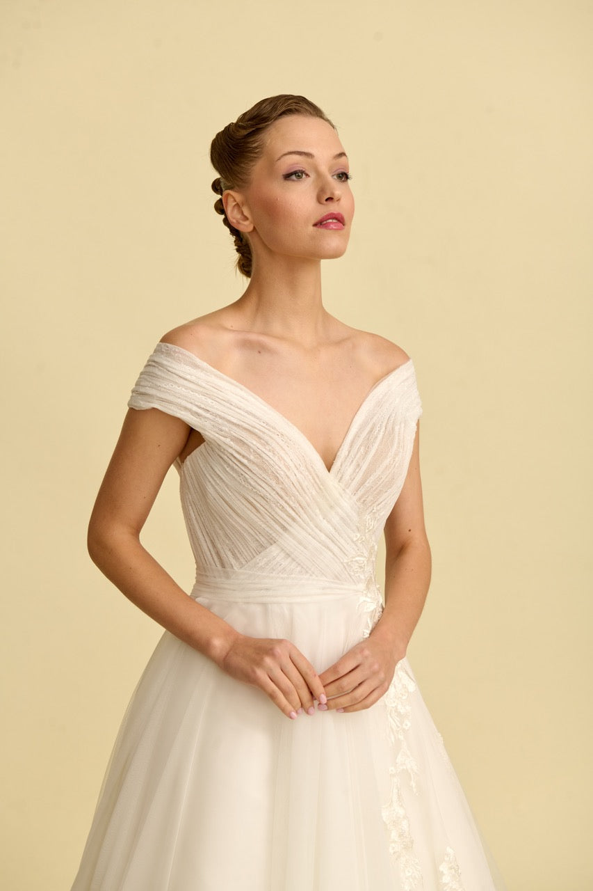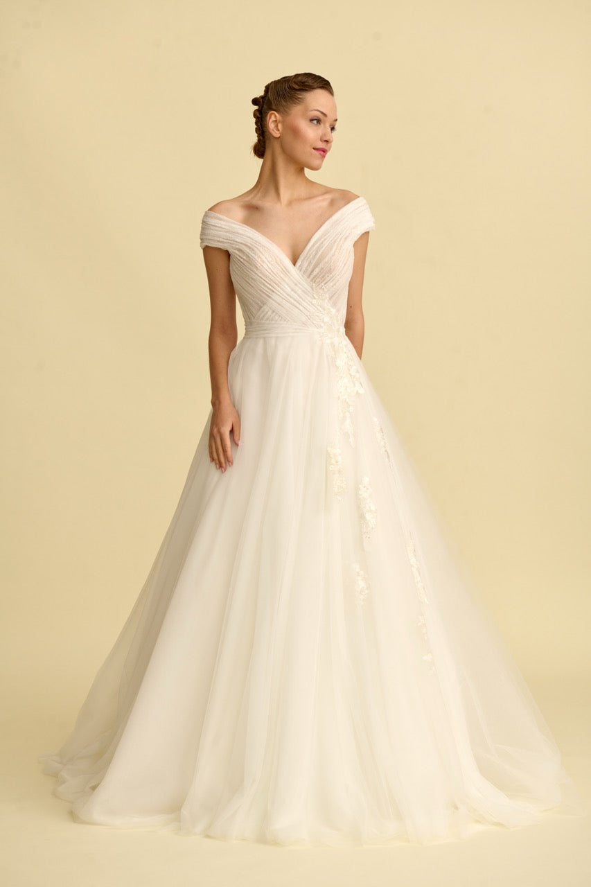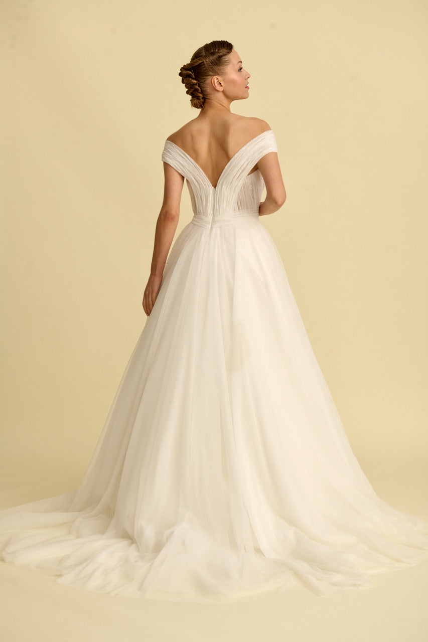 Tülün hafifliğini dantelin zarafetiyle birleştiren bu prenses gelinlik, V yaka tasarımıyla asil bir duruş sunar. Her adımda büyüleyici bir ışıltı hissedilir.
