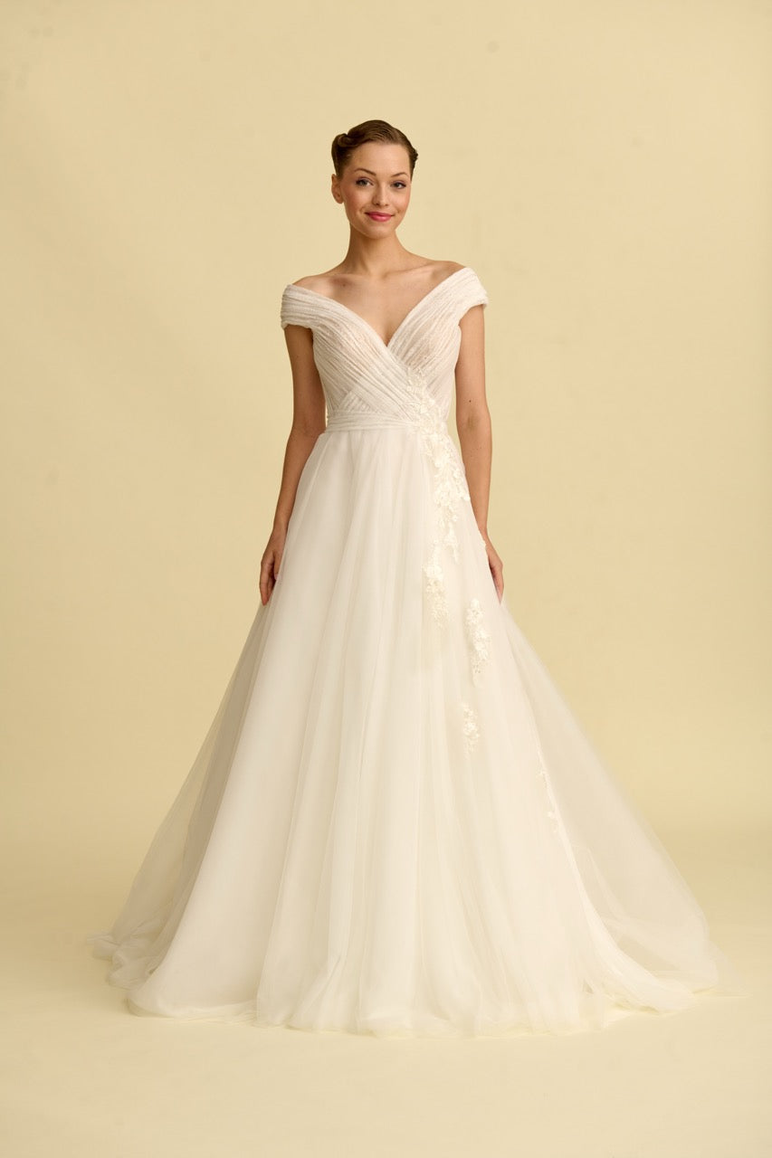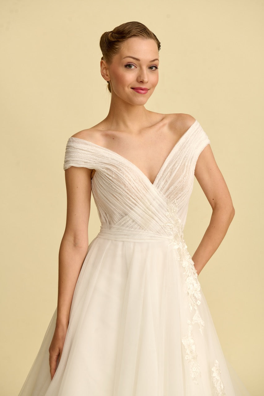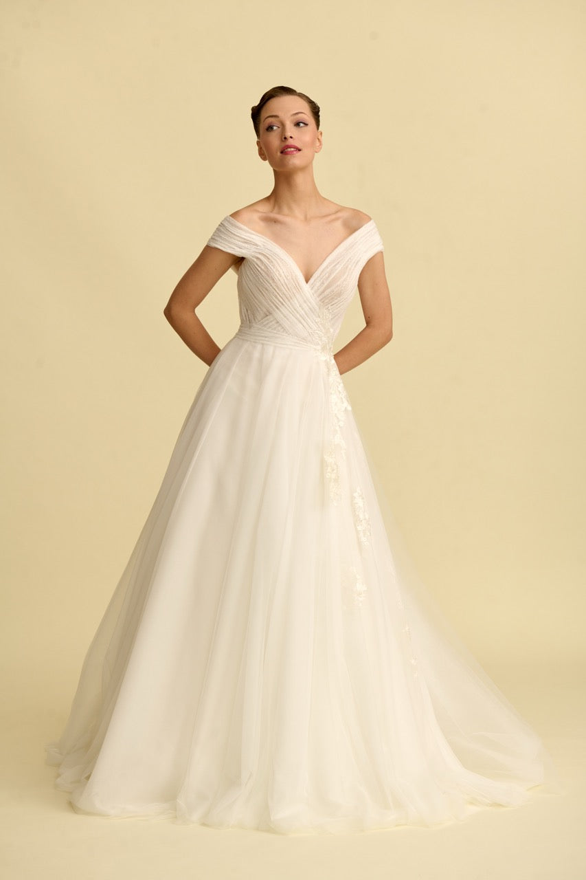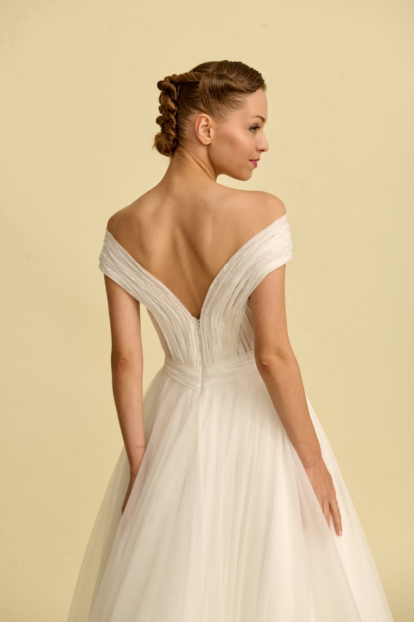 Tülün hafifliğini dantelin zarafetiyle birleştiren bu prenses gelinlik, V yaka tasarımıyla asil bir duruş sunar. Her adımda büyüleyici bir ışıltı hissedilir.
