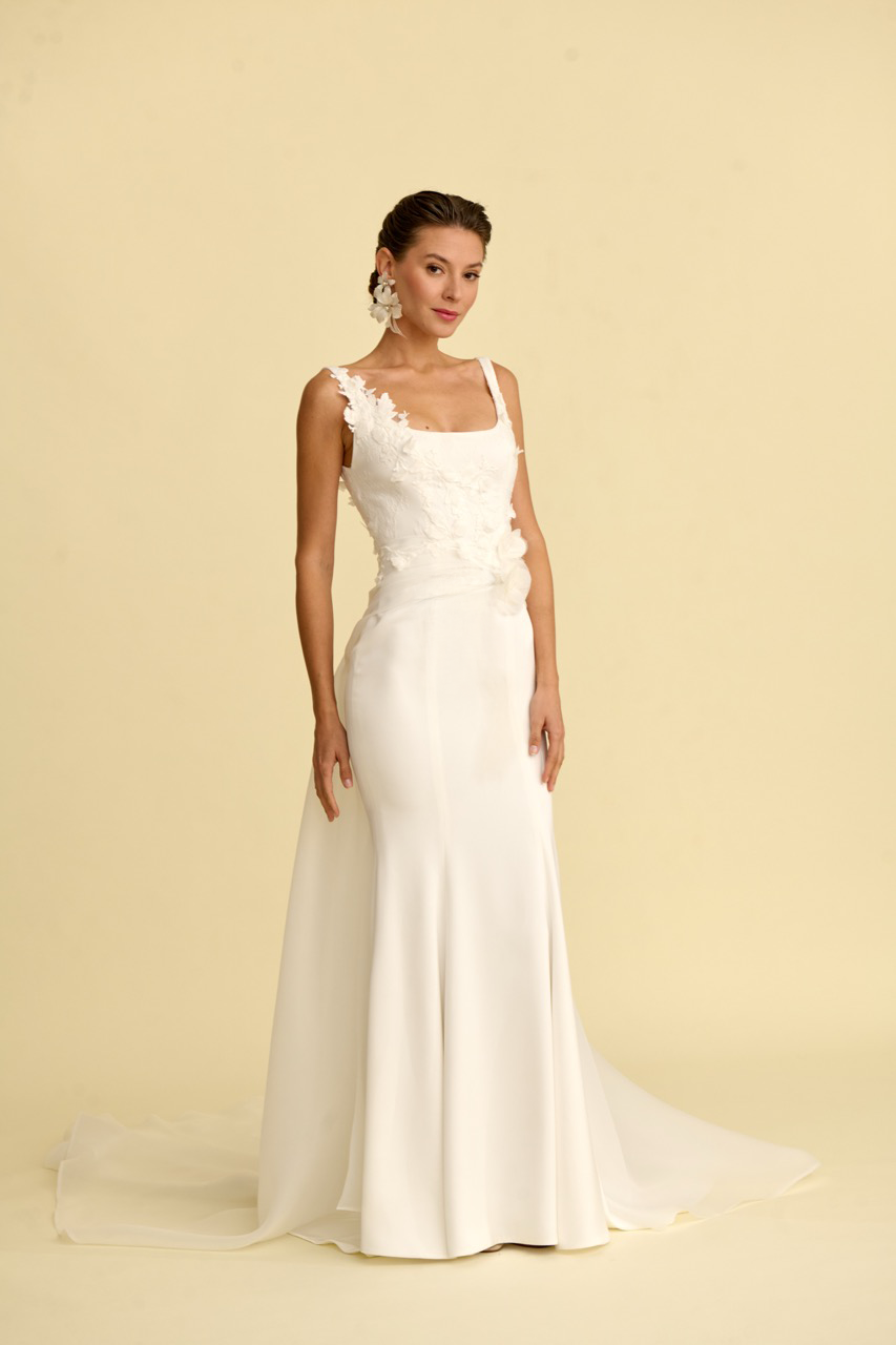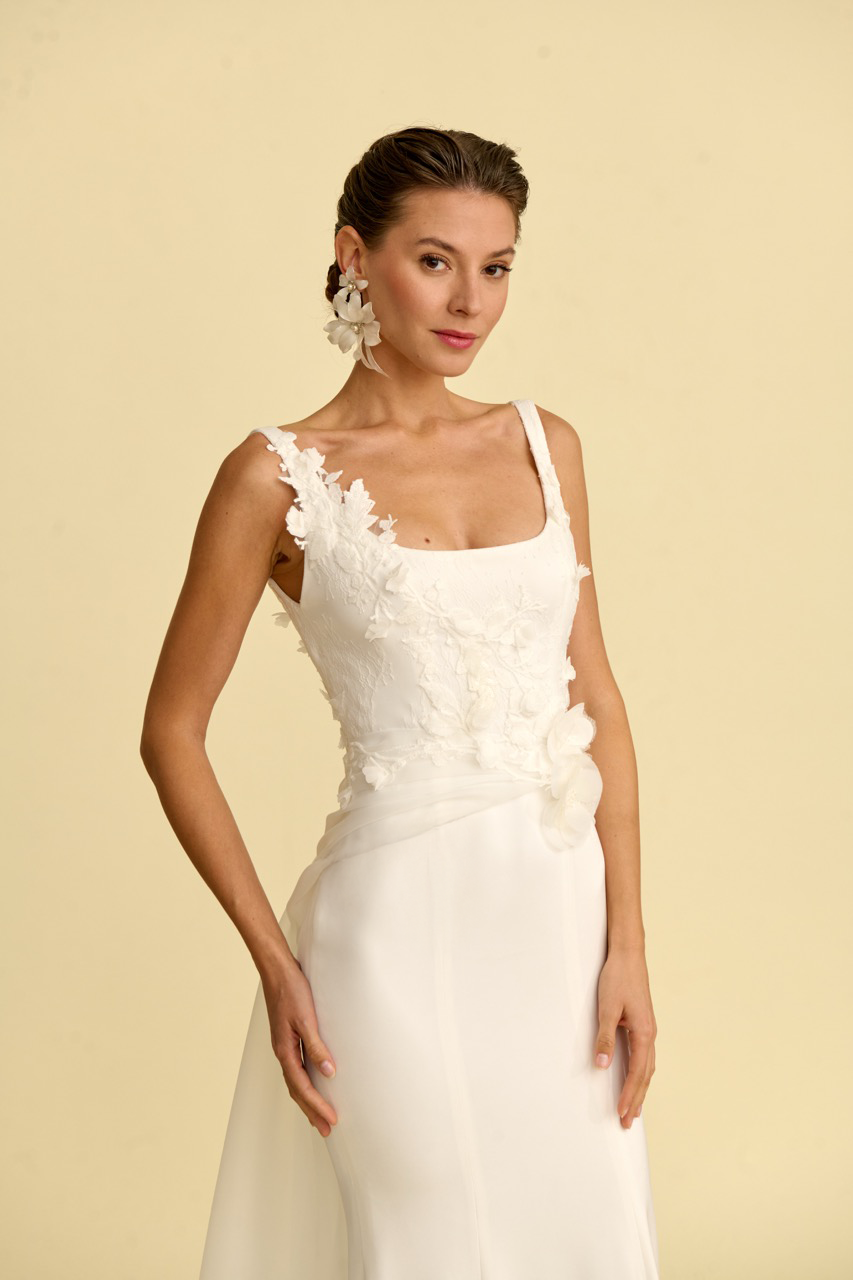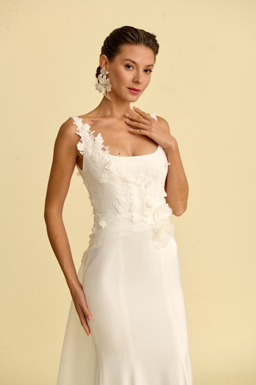 Bedeni zarifçe saran bu balık kesim gelinlik modeli, modern kare yaka detayı ve akıcı silüetiyle dikkat çeker. İnce işçilikle hazırlanan çiçek detayları gelinliğe romantik ve asil bir ışıltı kazandırırken, balık formu vücut hatlarını zarif şekilde vurgular. Modern tasarım çizgileriyle çağdaş bir duruş sunan bu model, şık ve etkileyici bir gelinlik arayan gelin adayları için tasarlanmıştır.