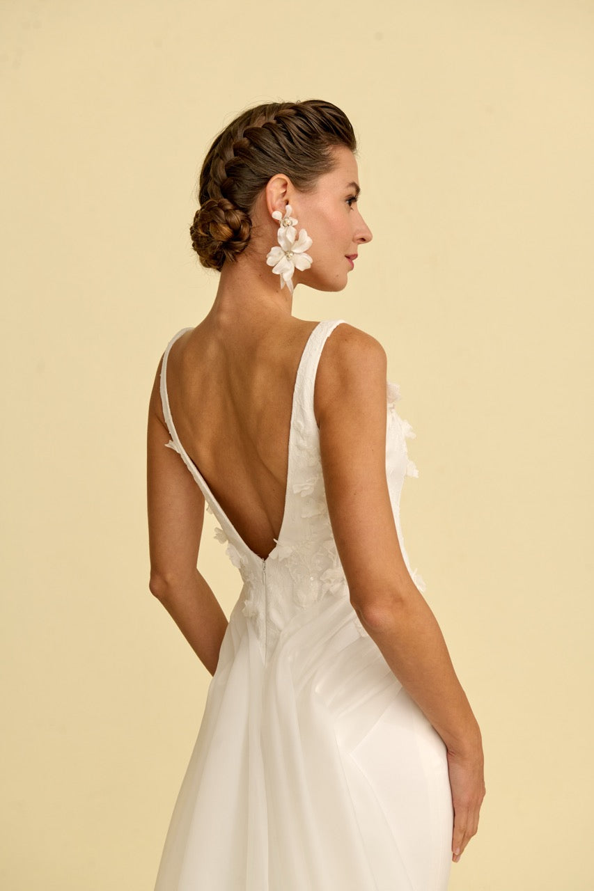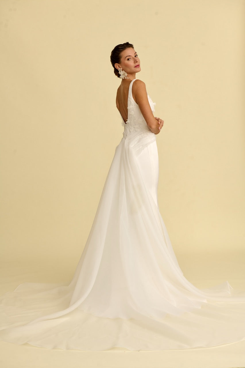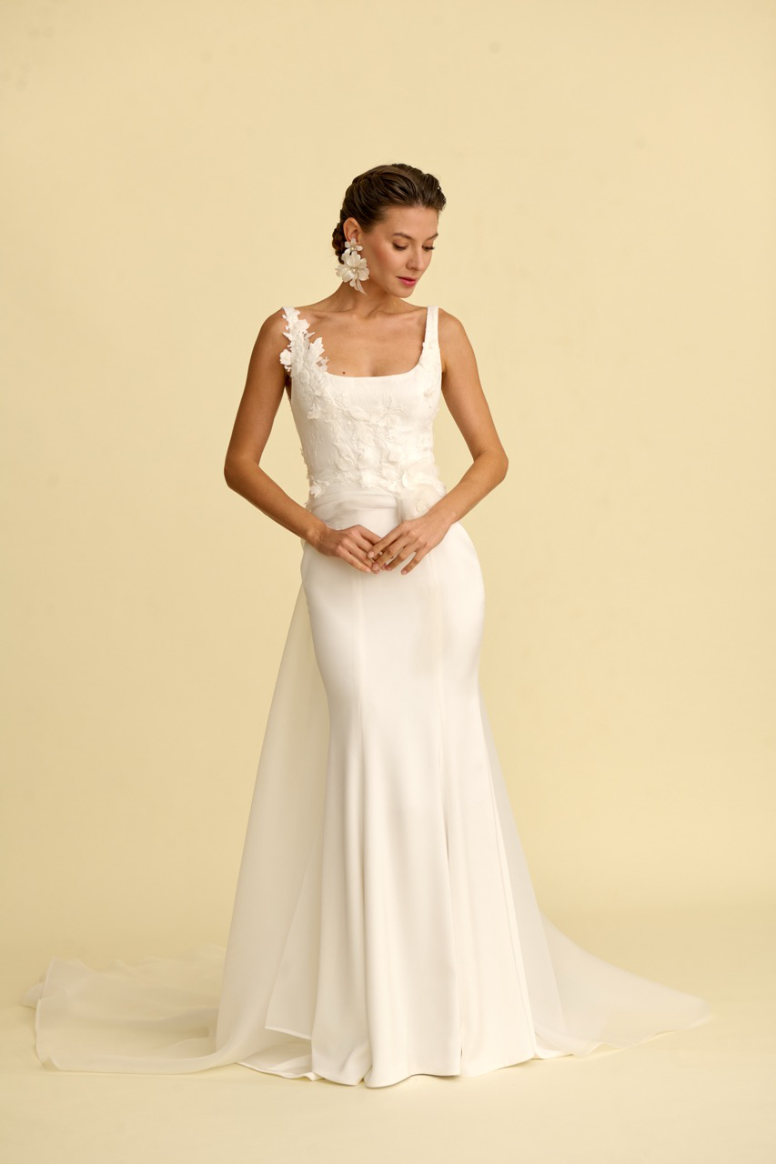 Bedeni zarifçe saran bu balık kesim gelinlik modeli, modern kare yaka detayı ve akıcı silüetiyle dikkat çeker. İnce işçilikle hazırlanan çiçek detayları gelinliğe romantik ve asil bir ışıltı kazandırırken, balık formu vücut hatlarını zarif şekilde vurgular. Modern tasarım çizgileriyle çağdaş bir duruş sunan bu model, şık ve etkileyici bir gelinlik arayan gelin adayları için tasarlanmıştır.