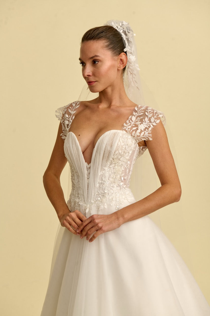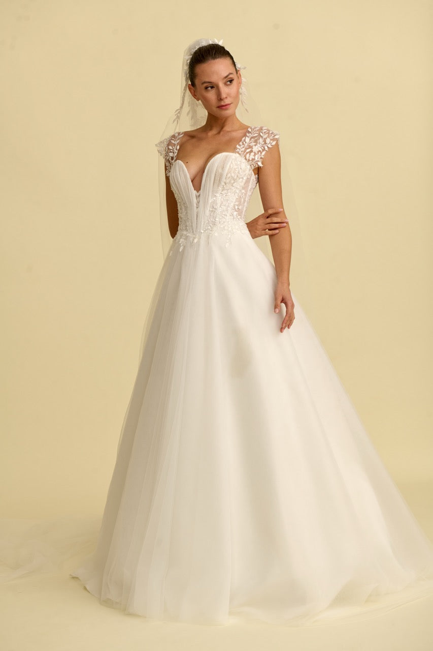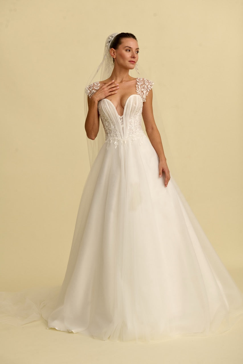 V yaka tasarımıyla modern bir zarafet sunan bu prenses gelinlik modeli, dantel ve tülün büyüleyici uyumuyla dikkat çeker. Hacimli prenses silüeti ve ince işçilikle hazırlanan dantel detayları gelinliğe romantik ve sofistike bir karakter kazandırırken, akıcı tül etek tasarımın masalsı duruşunu tamamlar. Zarif ve etkileyici bir prenses gelinlik arayan gelin adayları için tasarlanmış özel bir gelinlik modelidir.