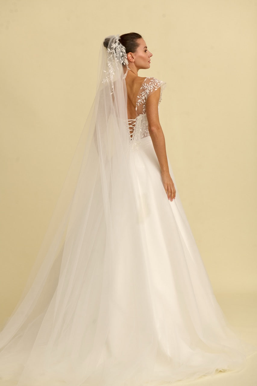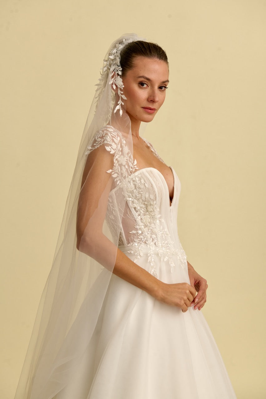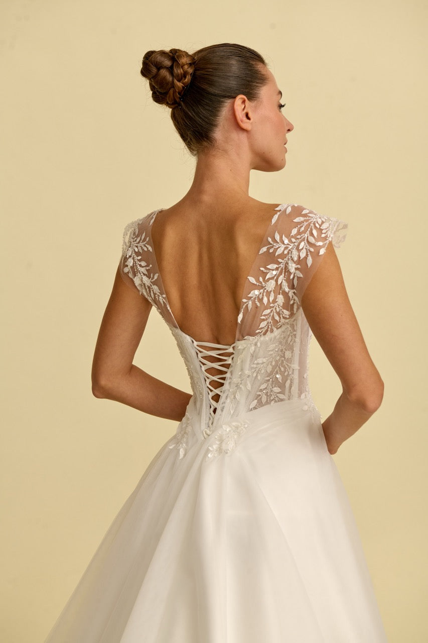 V yaka tasarımıyla modern bir zarafet sunan bu prenses gelinlik modeli, dantel ve tülün büyüleyici uyumuyla dikkat çeker. Hacimli prenses silüeti ve ince işçilikle hazırlanan dantel detayları gelinliğe romantik ve sofistike bir karakter kazandırırken, akıcı tül etek tasarımın masalsı duruşunu tamamlar. Zarif ve etkileyici bir prenses gelinlik arayan gelin adayları için tasarlanmış özel bir gelinlik modelidir.