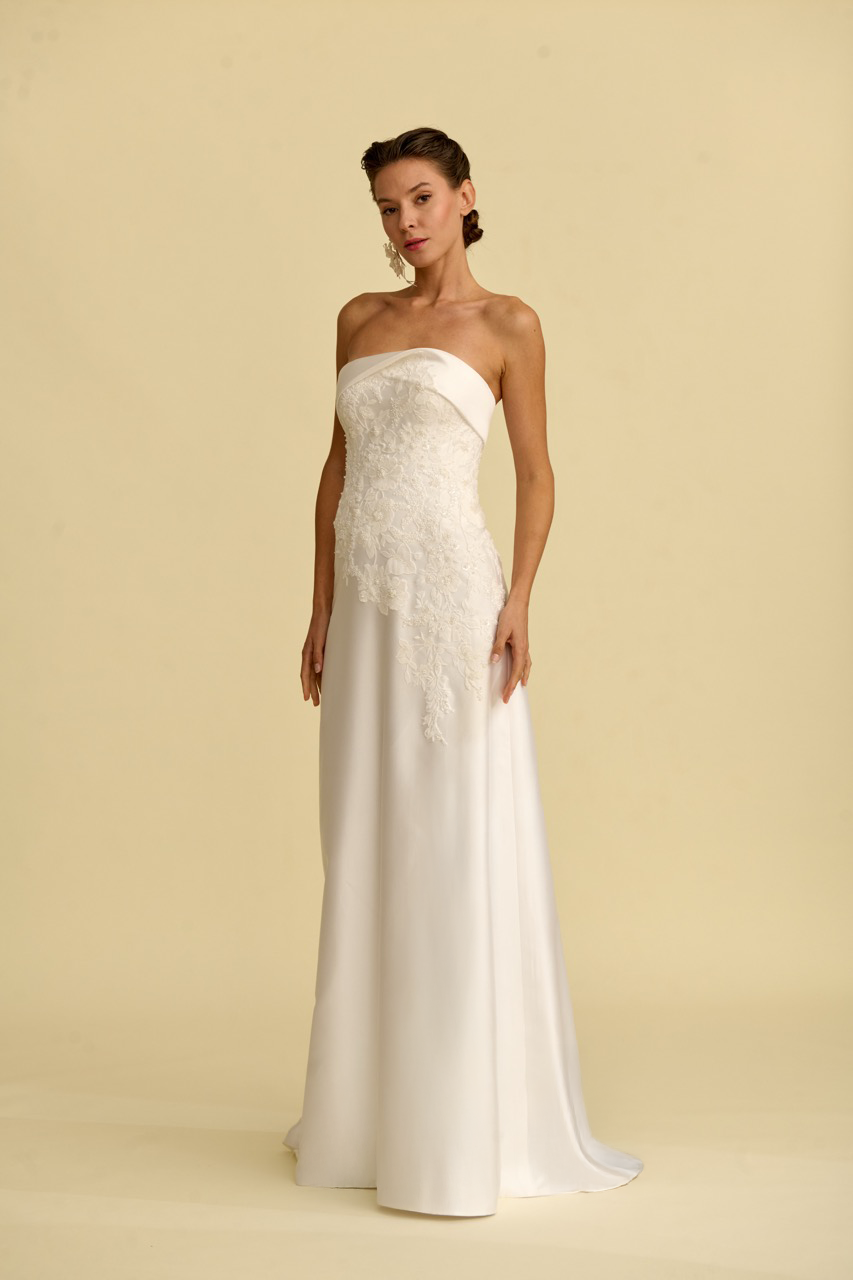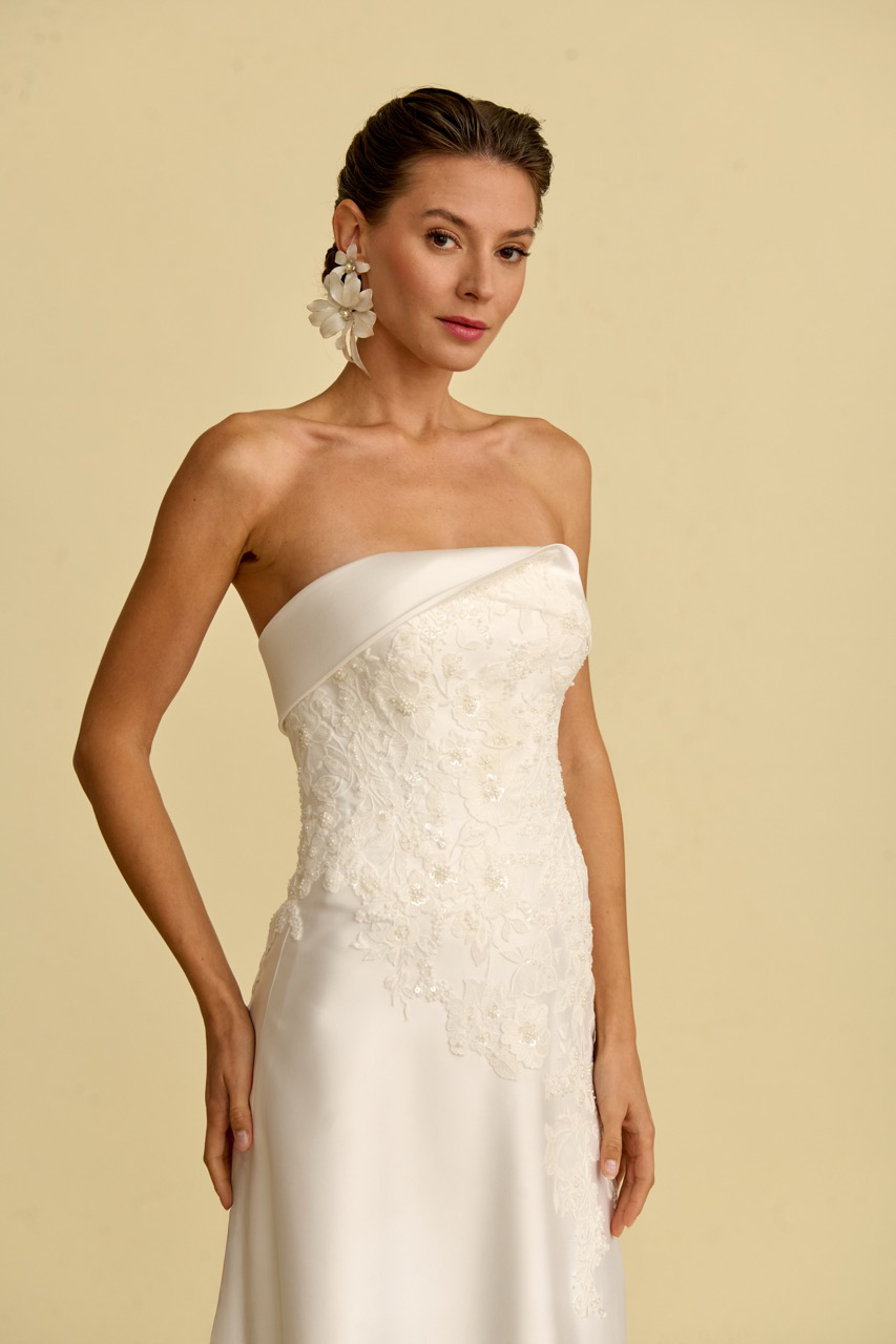 Modern tasarım çizgileriyle öne çıkan bu straplez saten gelinlik modeli, akıcı silüeti ve zarif işlemeleriyle sade ama etkileyici bir görünüm sunar. Straplez kesimi omuzları ve dekolteyi zarif şekilde vurgularken, saten kumaşın doğal ışıltısı gelinliğe sofistike bir karakter kazandırır. Minimalist zarafeti tercih eden gelin adayları için tasarlanmış modern ve şık bir gelinlik modelidir.