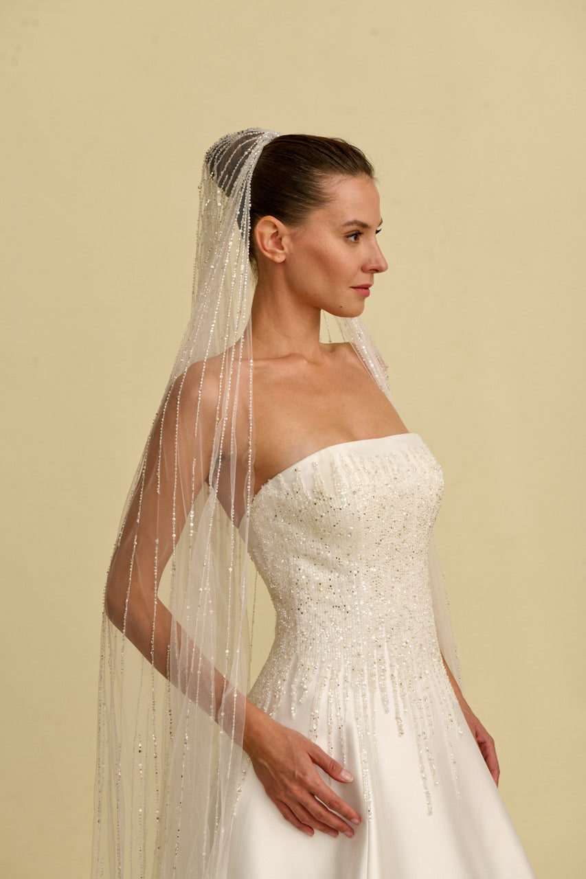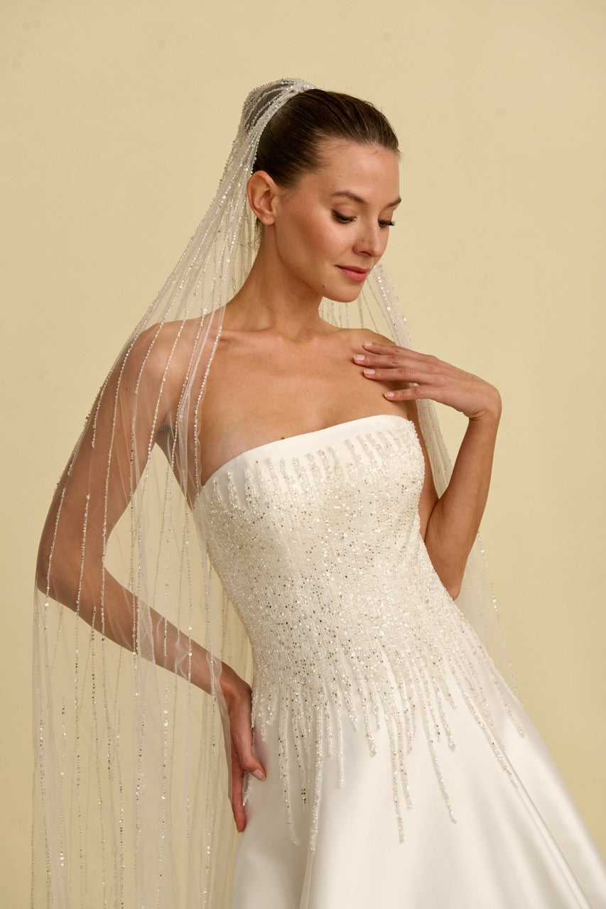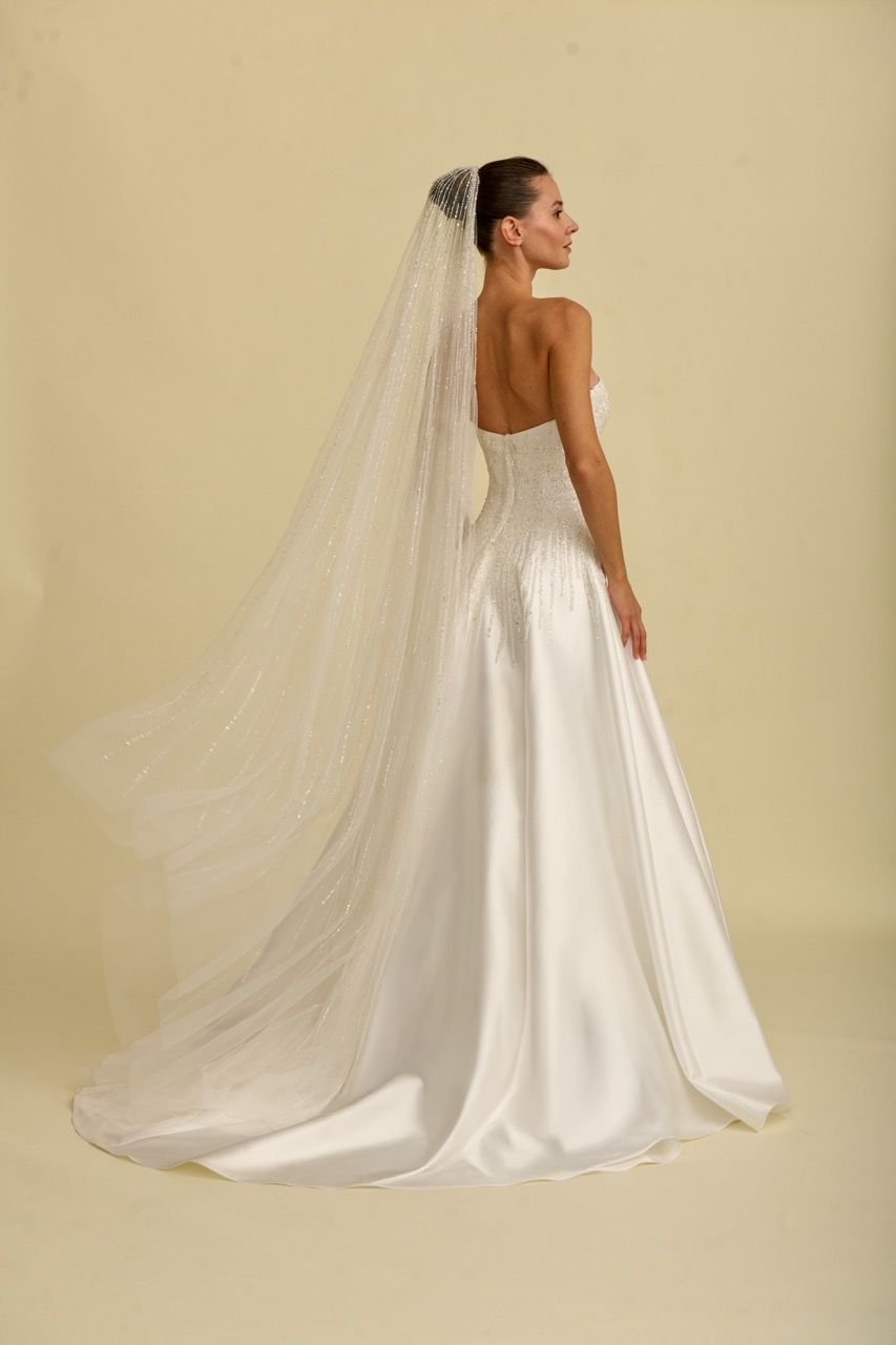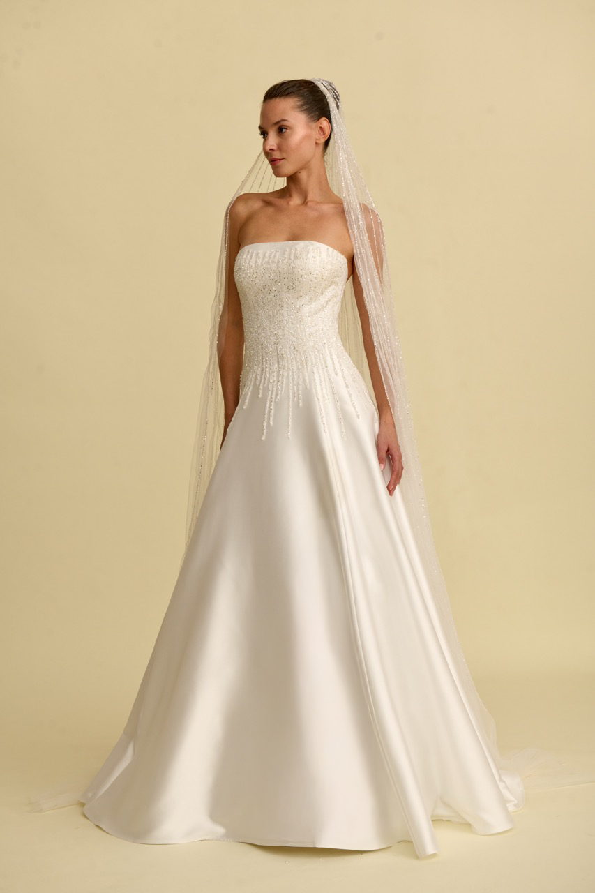 Kasnak işlemeleriyle zenginleşen bu saten prenses gelinlik modeli, göz alıcı detayları ve zarif silüetiyle dikkat çeker. Straplez kesimi omuzları ve dekolteyi zarif şekilde vurgularken, hacimli prenses formu gelinliğe hem modern hem de ihtişamlı bir karakter kazandırır. İnce işçilikle hazırlanan kasnak işlemeleri tasarımın ışıltılı ve sofistike duruşunu ön plana çıkararak etkileyici bir gelinlik modeli sunar.