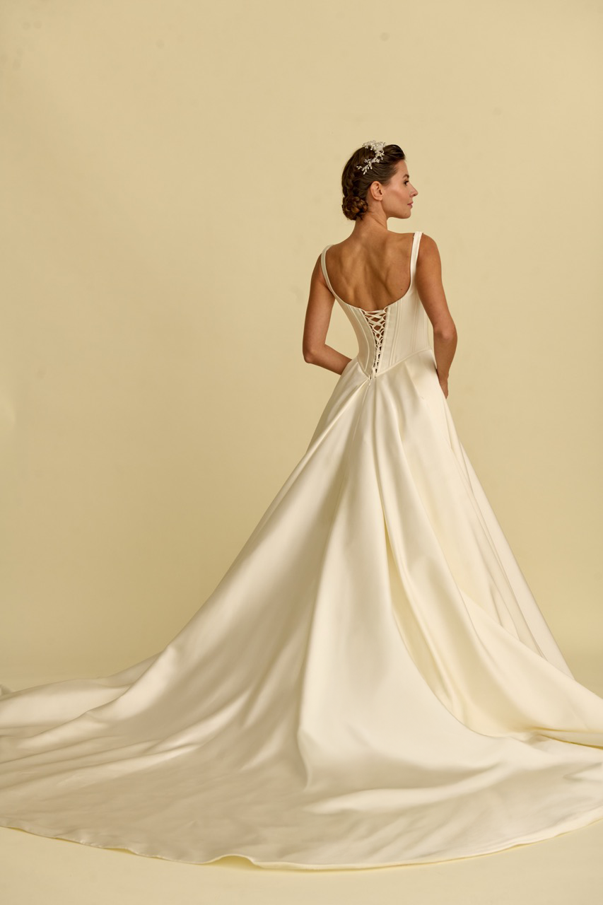 Modern kare yaka tasarımı, işlemeli korsesiyle zarafeti incelikle vurguluyor. Prenses kesimi ile zamansız bir güzelliği çağdaş bir dokunuşla ortaya çıkaran prenses gelinlik modeli.