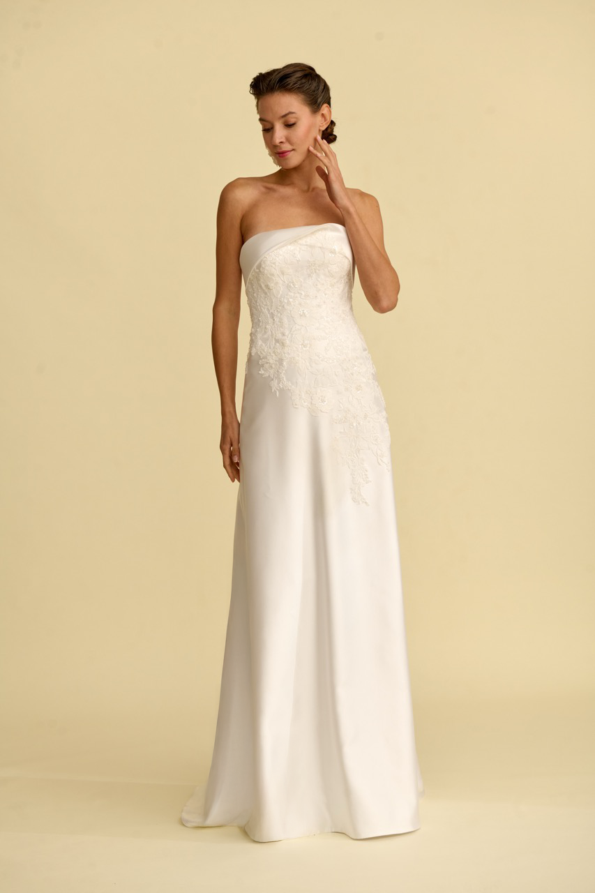 Modern çizgilere sahip bu straplez saten gelinlik modeli, sade ama göz alıcı işlemeleriyle öne çıkan bir tasarım. Minimalist zarafeti seven gelinler için ideal.