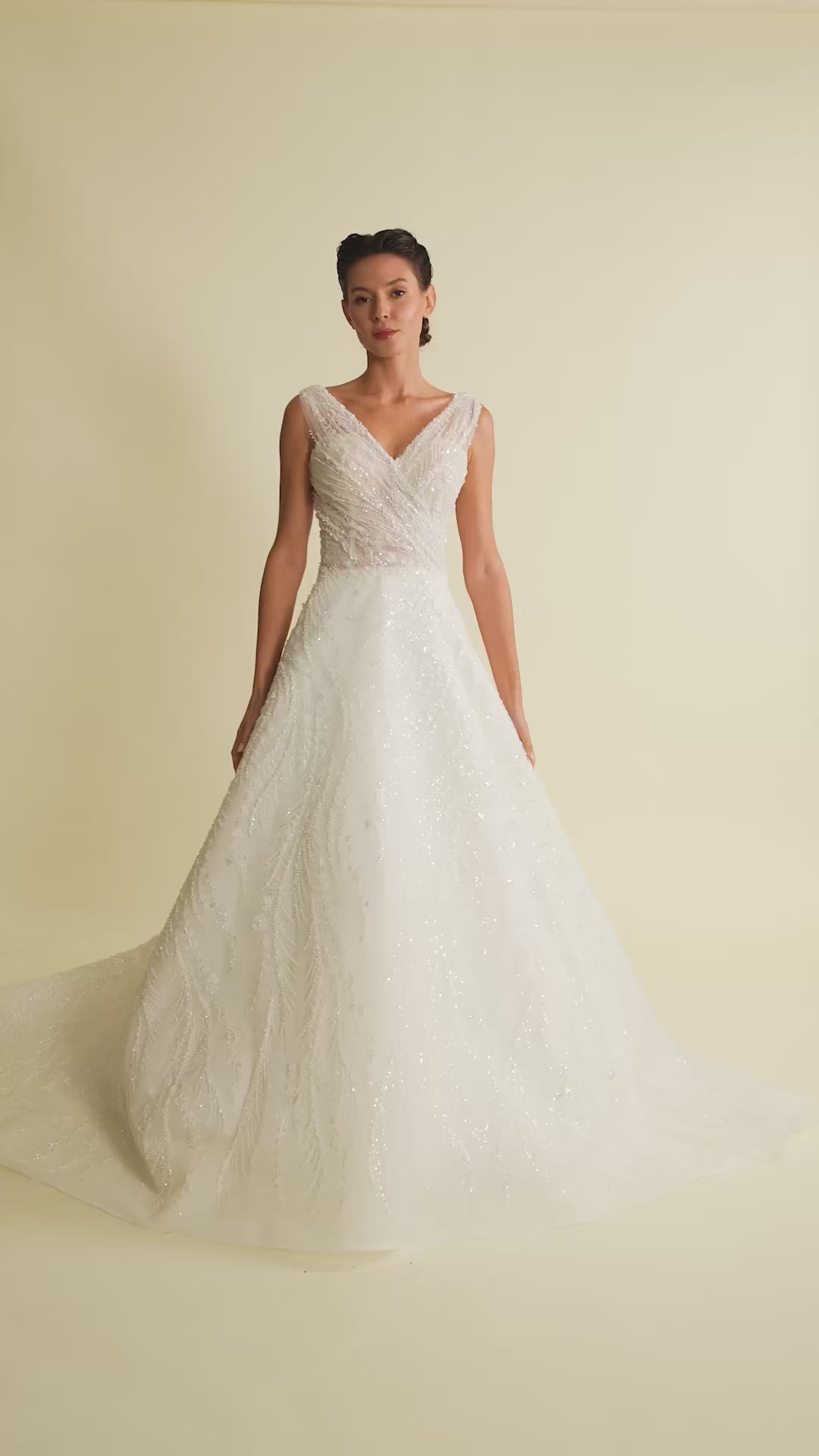 Baştan aşağı dantel işlemeleriyle ışıltılı bir görünüm sunan bu prenses model, beden formuyla zarif bir bütünlük oluşturur.