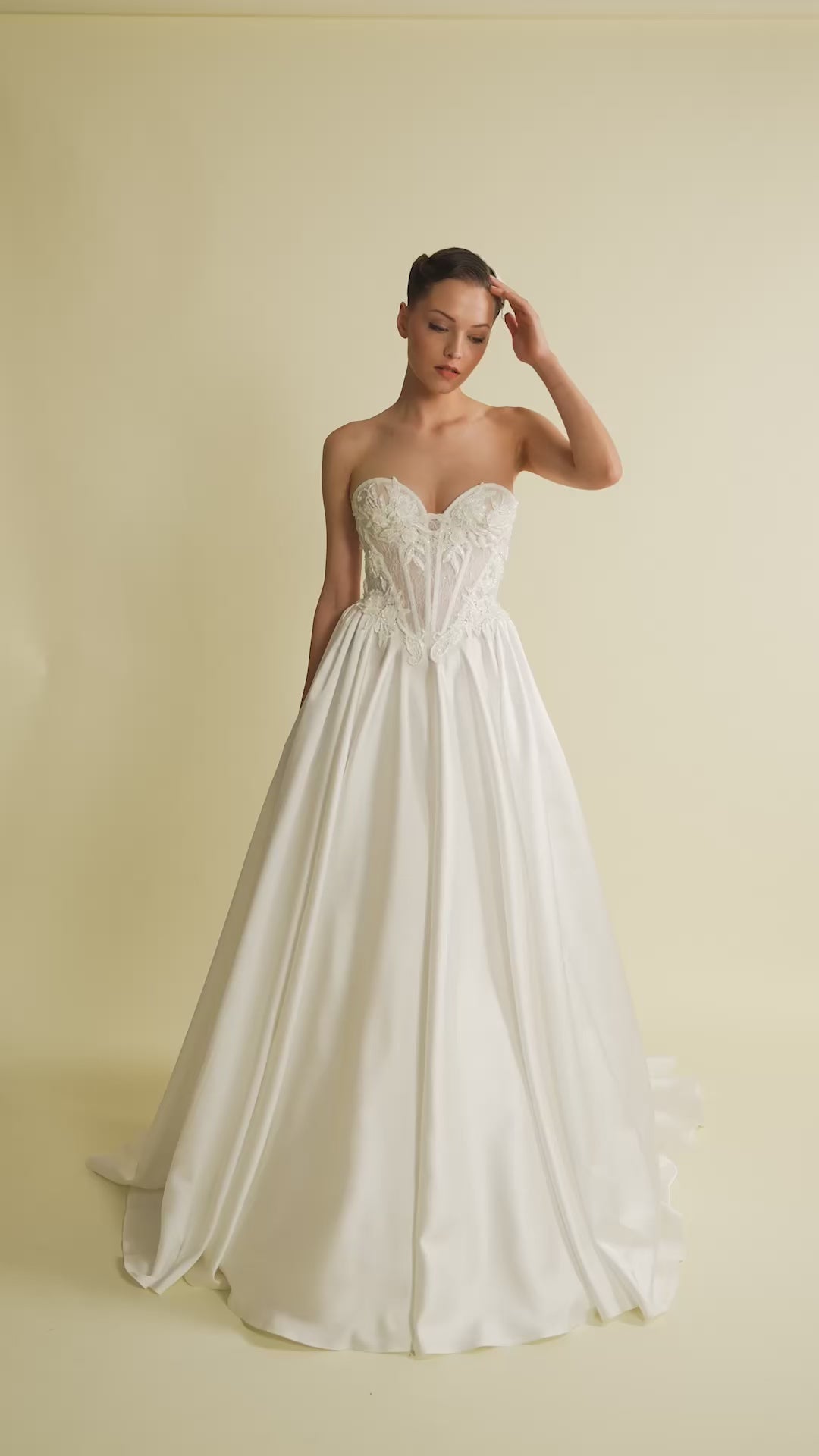Saten etek dokusu ve dantel bedeniyle dikkat çeken bu model, klasik güzelliği modern çizgilerle yeniden yorumlar.