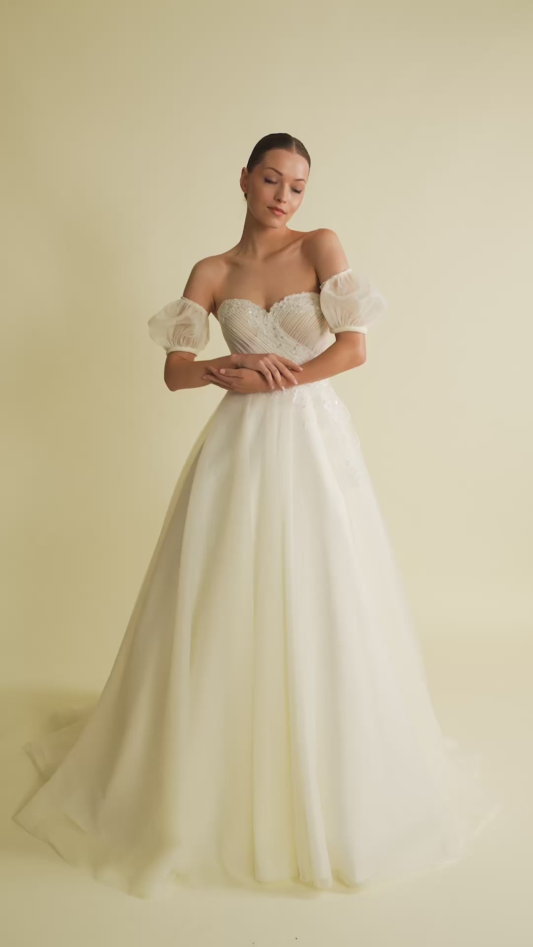 İncelikli zanaatiyle kabarık ve masalsı bir siluet sunan bu prenses model, işleme detaylarıyla modern bir ihtişama sahip.