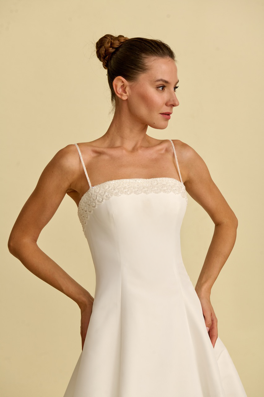 İşlemeli yaka detayıyla farklılaşan bu A kesim model, zarif askıları ve sade formuyla klasik bir zarafete sahip.