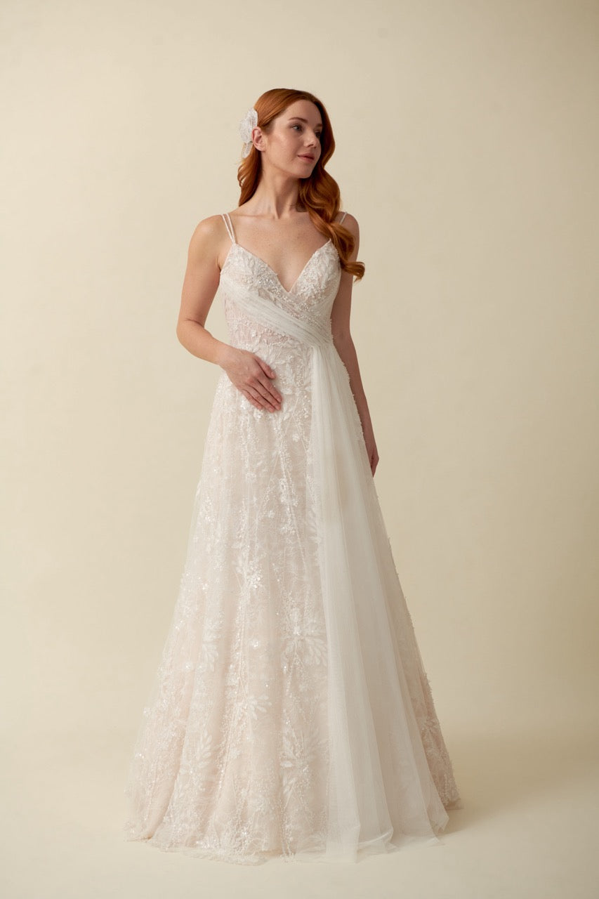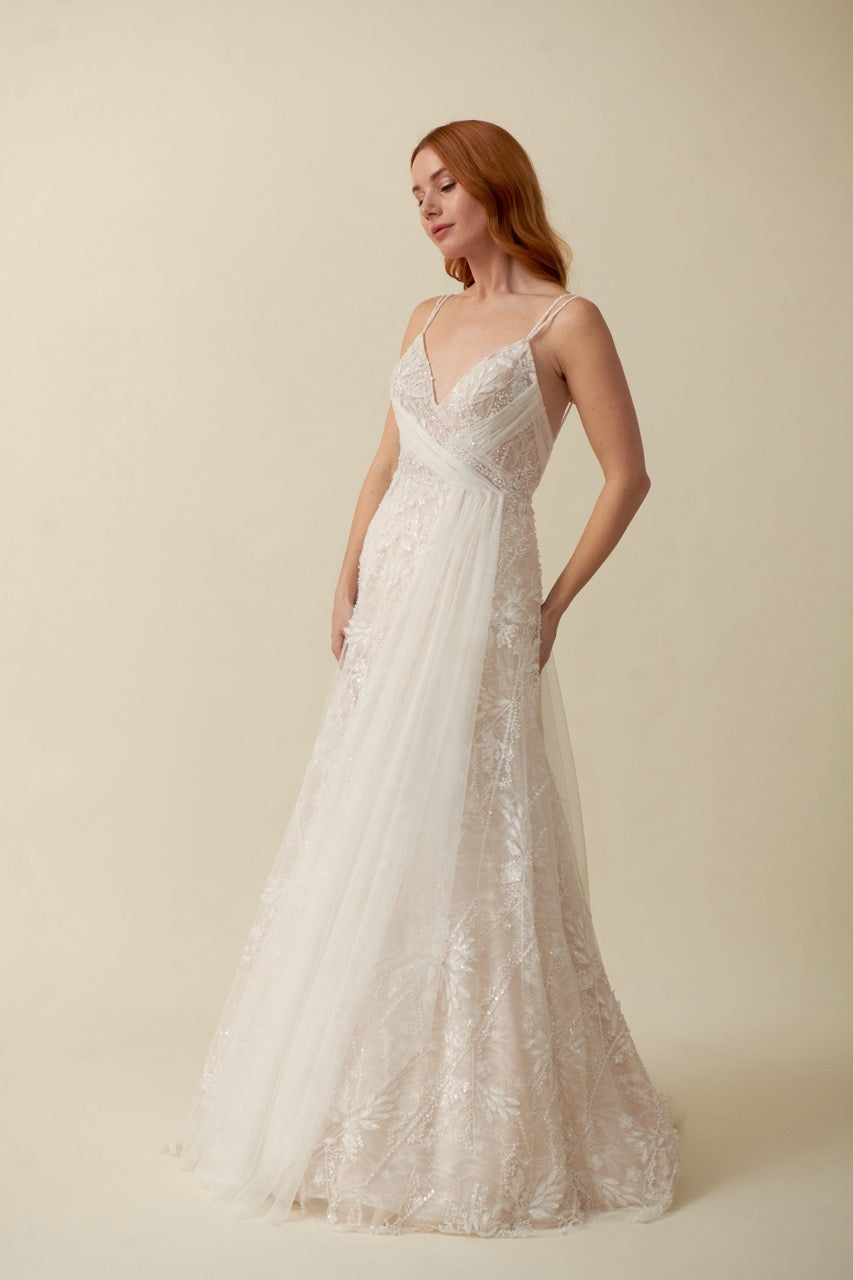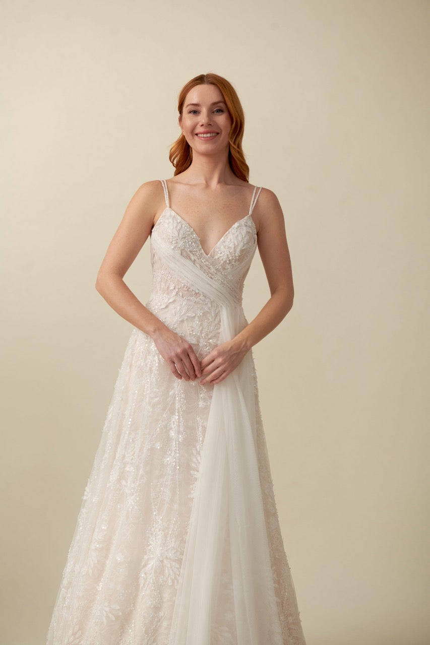 Combining dazzling elegance with modern lines, this A-line lace wedding dress offers a noble and romantic style. Featuring exquisite lace details, this dress model provides a balanced and elegant look to the figure thanks to its A-line silhouette. Standing out among A-line wedding dress models, this design is an ideal choice for brides seeking an elegant and timeless wedding dress.