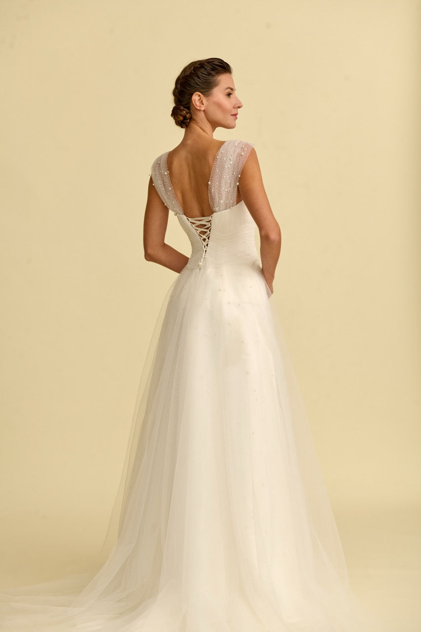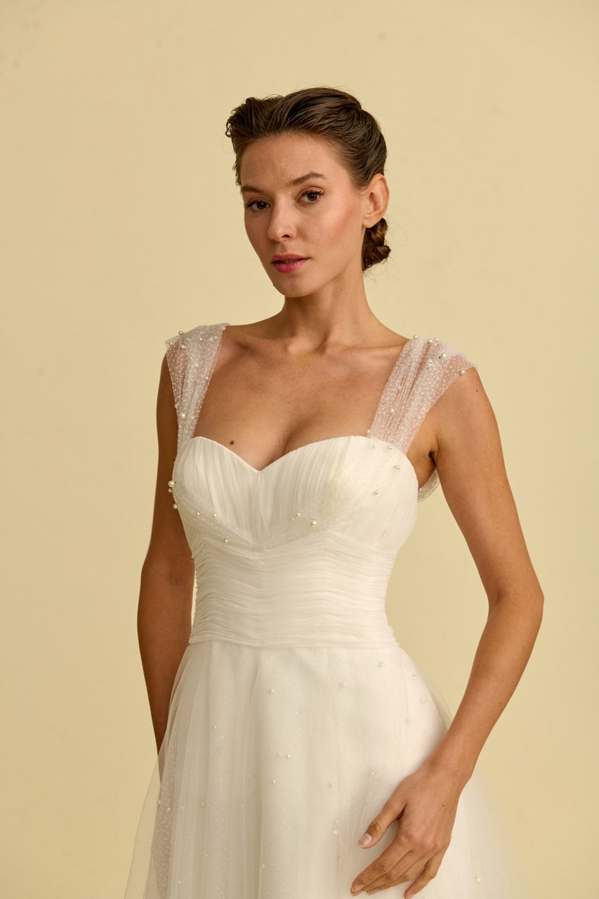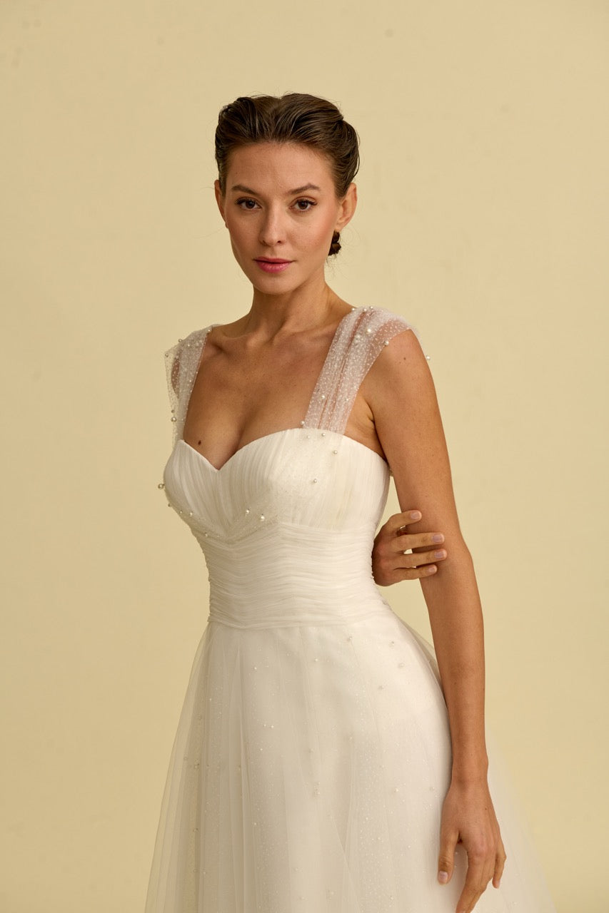 This A-line wedding dress , adorned with delicate pearl embellishments, stands out with its simple yet striking design lines. The strapless style gives the shoulders a natural and elegant look, while the delicate pearl details add a sophisticated and noble character to the dress. With its flowing A-line silhouette and elegant details, it is a special wedding dress designed for brides seeking a modern and romantic wedding gown.