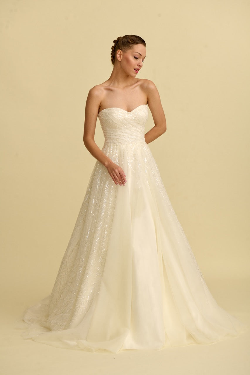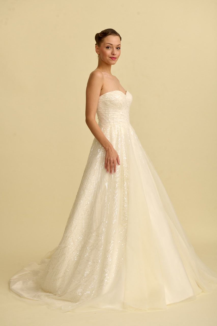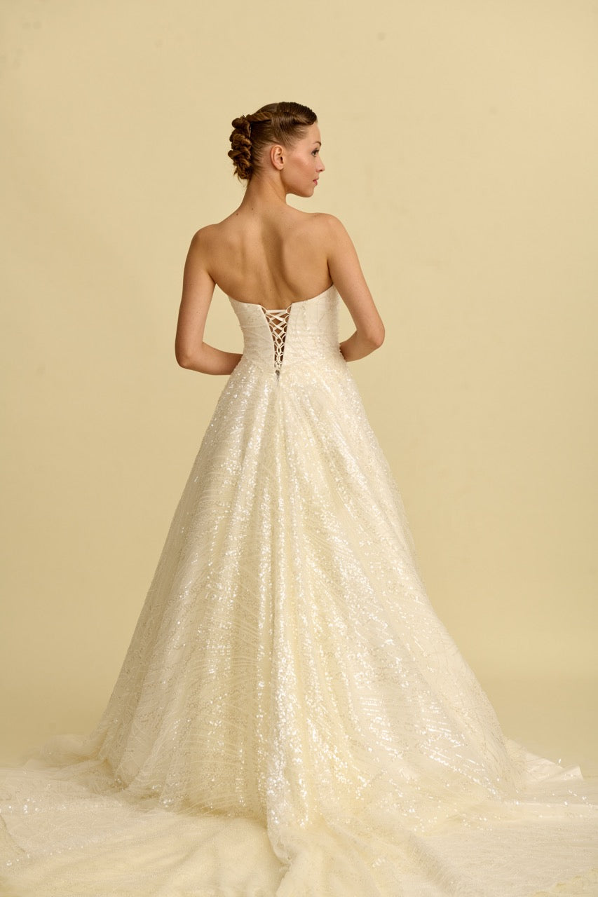 This wedding dress , offering an elegant contrast with its lace-embroidered bodice and flowing tulle skirt, stands out with its romantic design lines and sophisticated silhouette. The finely crafted lace details add grace to the dress, while the light tulle skirt gives it a flowing and elegant look. It is a special wedding dress designed for brides seeking a romantic and stylish gown.