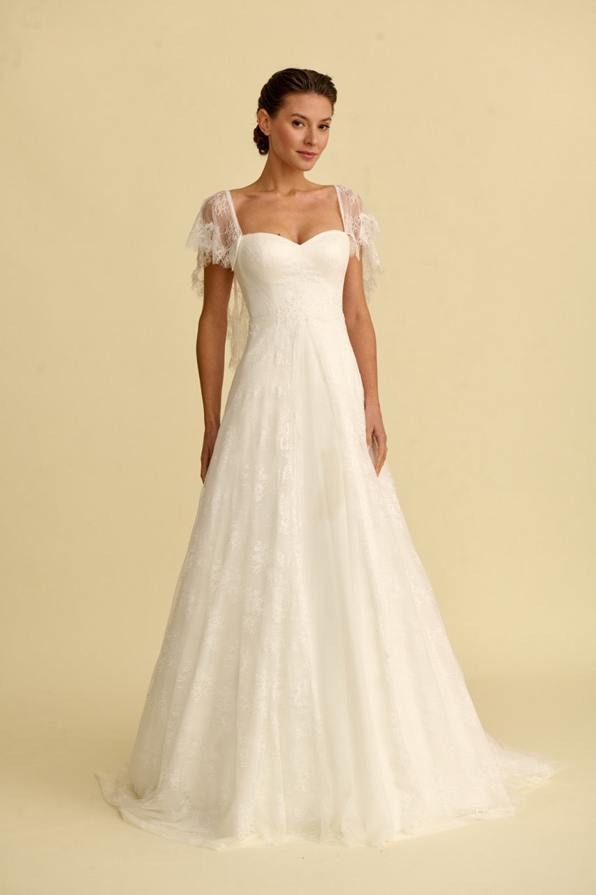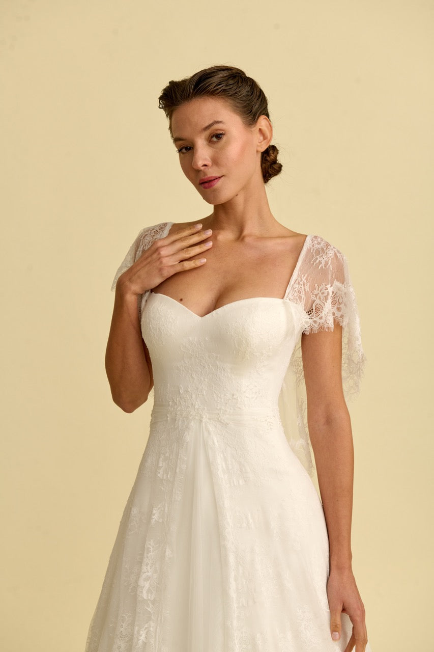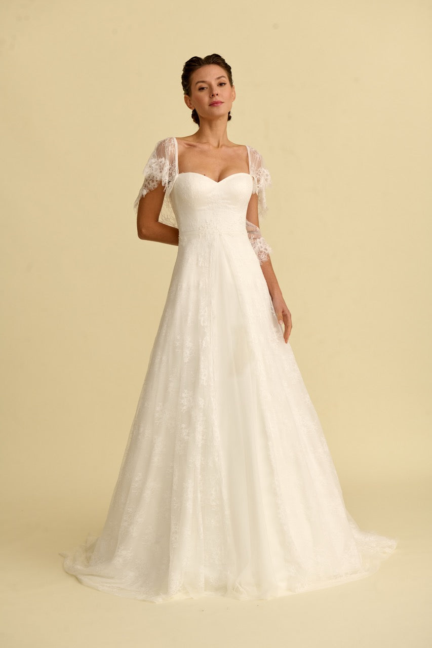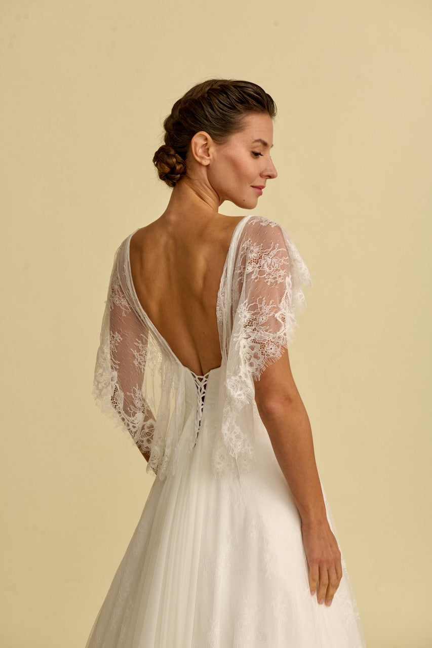 Featuring romantic lace details and an elegant batwing sleeve design, this A-line wedding dress reinterprets the classic silhouette with unique grace. The flowing A-line form gives the dress a romantic and balanced look, while the finely crafted lace details highlight the sophisticated character of the design. It is a special wedding dress designed for brides who love a bohemian spirit and natural elegance.